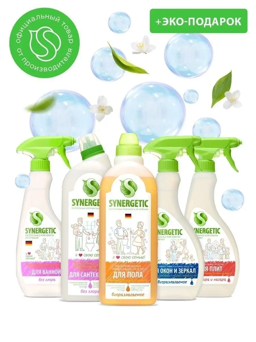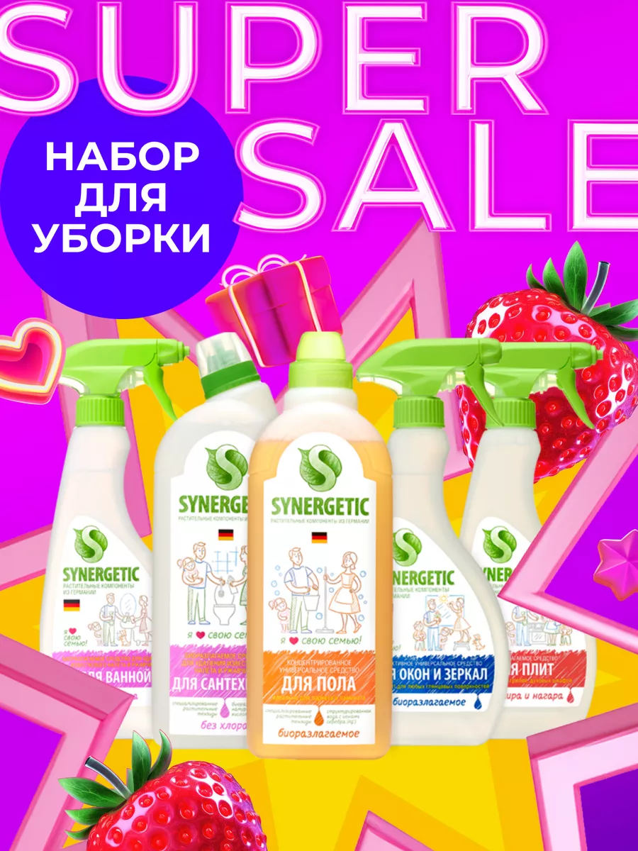 Описание: Набор экосредств "Идеальная уборка", 5 предметов Универсальный набор средств для уборки "Идеальная уборка" SYNERGETIC поможет создать и поддерживать чистоту всего дома. Экосредства SYNERGETIC гипоаллергенные и биоразлагаемые, а значит, не вредят человеку и безопасны для природы. Созданы на основе растительных компонентов и получили экологическую сертификацию. Заказать набор SYNERGETIC выгоднее, чем каждое средство отдельно. Мы собрали в набор средства для уборки вашего дома, для любых видов поверхностей. Хотите иметь чистый и безопасный дом, но не хотите отравлять его вредными химическими средствами? Тогда Набор чистящих эко средств для уборки дома, 5 предметов бренда SYNERGETIC - это то, что вам нужно! Наш набор состоит из экологичных и безопасных средств, которые помогут вам быстро и эффективно очистить любую поверхность. В наборе вы найдете универсальное моющее cредство 1л., предназначенное для мытья и ухода за полом, и другими видами моющихся поверхностей. Чистящее средство для стекол и зеркал 500мл. из нашего набора также содержит только натуральные компоненты и не оставляет разводов на стеклах и зеркалах. Средство от известкового налета ржавчины для ванных комнат 500мл. поможет вам легко и быстро очистить любую ванную комнату от накипи и ржавчины, не повреждая поверхности. SYNERGETIC для мытья и уборки сантехники, 1 л. - это невероятно эффективное средство, которое избавит вашу ванную комнату от бактерий и гарантирует максимальную гигиену. А SYNERGETIC средство для чистки кухонных плит, 500 мл. позволит быстро и безопасно очистить вашу кухню от жира и других загрязнений, не оставляя следов. Весь наш набор чистящих эко средств для уборки дома, бренда SYNERGETIC содержит только натуральные компоненты, что делает его идеальным выбором для тех, кто ценит свое время и здоровье, а также хочет иметь максимально чистый и безопасный дом. Не откладывайте, заказывайте наш набор уже сегодня и получите максимальный результат в борьбе за чистоту и гигиену в вашем доме!