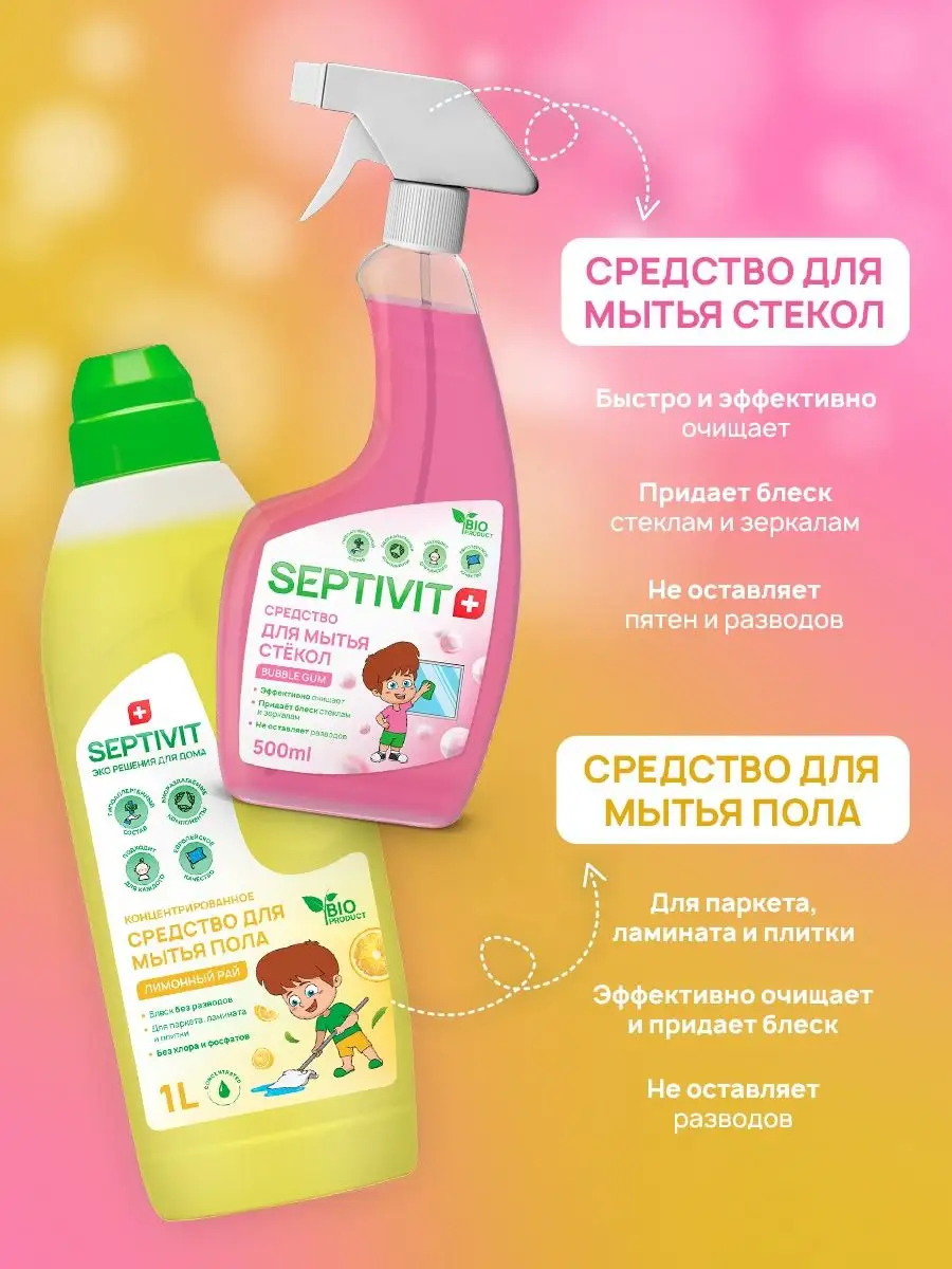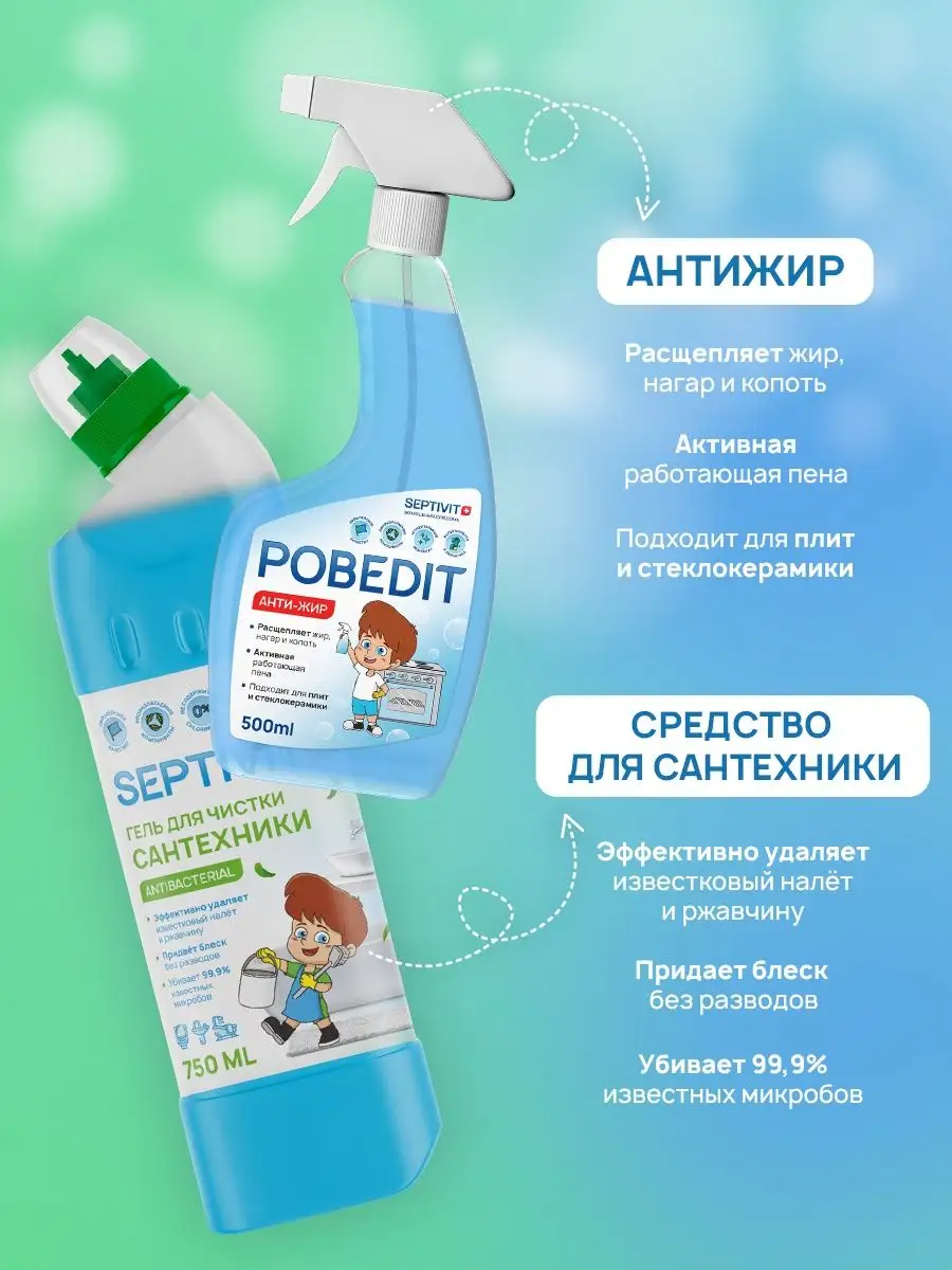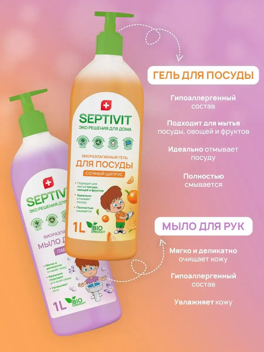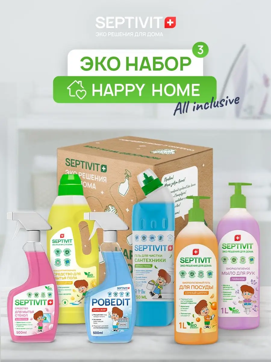 Описание: Универсальный набор эко-средств для дома - ALL INCLUSIVE для каждой хозяйки. Набор из 6 средств SEPTIVIT Premium поможет начать убираться с удовольствием, тратя на это минимум усилий и получая максимальный результат. В наборе собраны средства для мытья посуды, для чистоты пола, стеклянных и кухонных поверхностей, ванной комнаты и жидкое мыло для рук и тела. Набор HAPPY HOME - это эффективные средства, состоящие из биоразлагаемых компонентов, что делает их безопасными для природы и людей. Все средства из набора гипоаллергенны, а значит, прекрасно подходят для ежедневного использования детям и взрослым! Все средства сертифицированы в Международной организации по стандартизации ISO. Состав набора: - Гель для посуды "Сочный Цитрус" 1л; - Жидкое мыло "Лаванда" 1л; - Антижир "POBEDIT" 500мл; - Средство для чистки сантехники 750мл; - Концентрат для пола "Лимонный Рай" 1л; - Средство для мытья стёкол "Bubble Gum" 500мл. Septivit Premium - ЭКО-решения для Вашего дома!