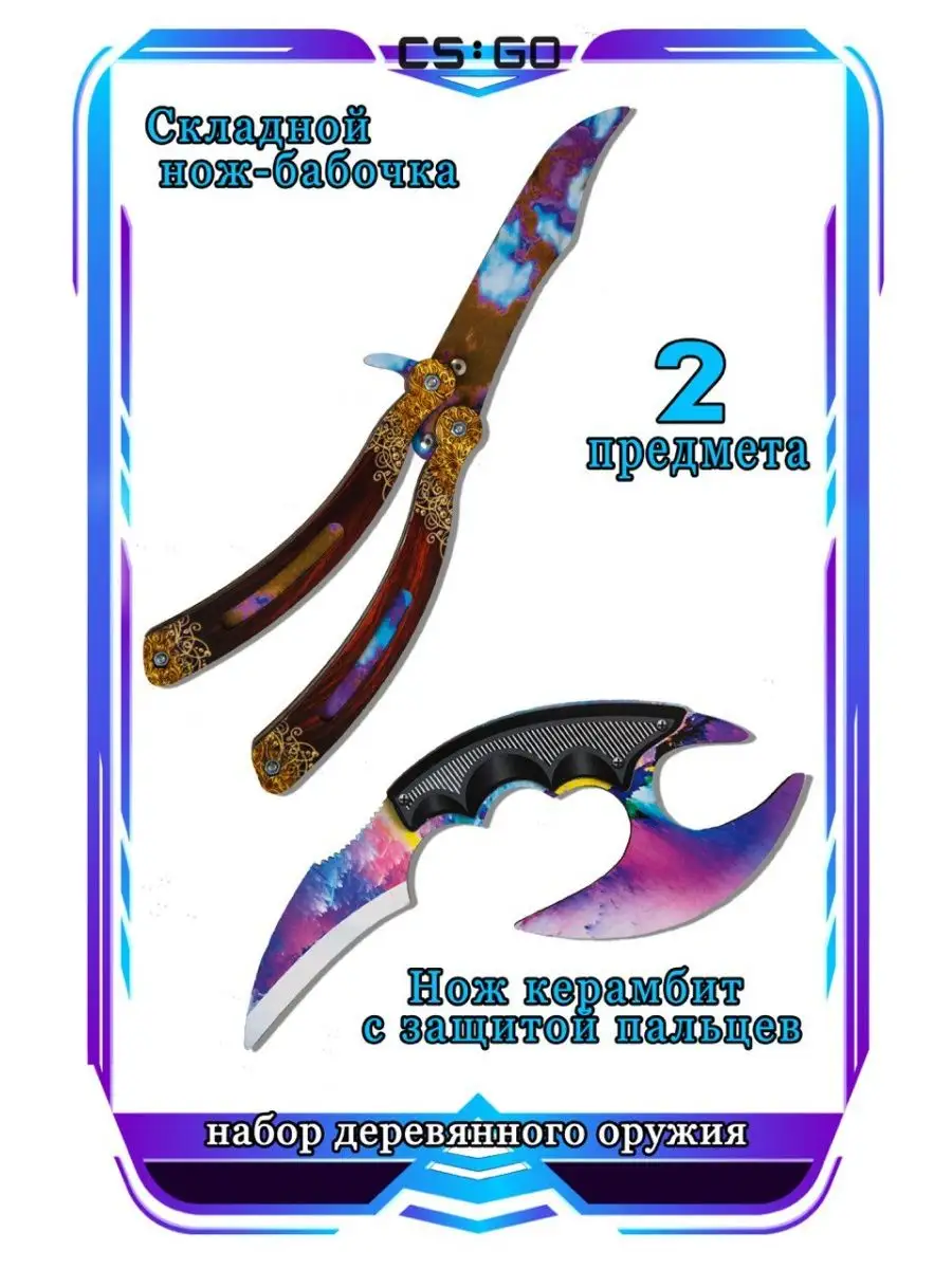 Артикул 166374277 Количество предметов в упаковке Нож-Бабочка 1 шт; Нож-Керамбит 1 шт; Набор оружия из 2 предметов