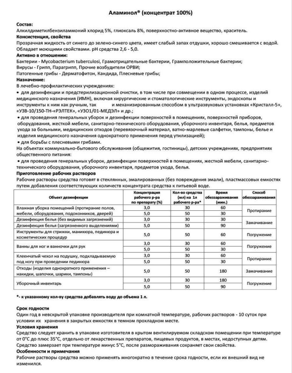 Раствор концентрата "Аламинол" применяется для дезинфекции и предстерилизационной очистки лотков, изделий медицинского назначения (ИМН), включая хирургические и стоматологические инструменты, как ручным, так и механизированным способом в ультразвуковых установках; для дезинфекции и ПСО маникюрных, педикюрных, парикмахерских и косметологических инструментов, таких как аппаратные фрезы и насадки, пинцеты, ножницы, кусачки, щипчики, кюретки, шаберы, пушеры, расчески, щетки и пр. из металла, пластика, стекла, резины и силикона.Дезинфектант эффективен в отношении бактерий, микобактерий туберкулеза, грибов рода Кандида, дерматофитов, вирусов, ВИЧ-инфекции.