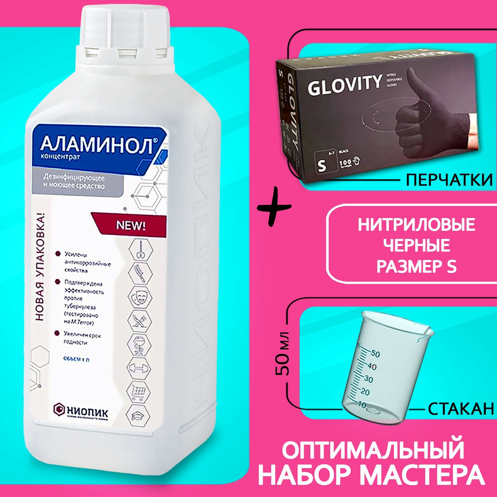 Аламинол концентрат 1 л. + перчатки нитрил черные размер S+мерный стакан