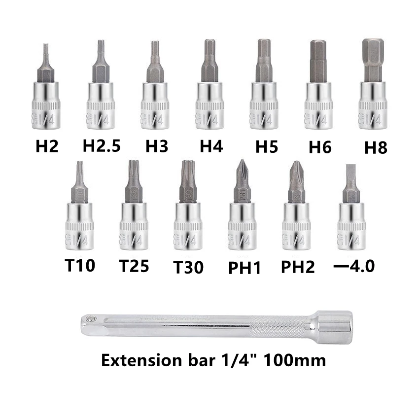 • Шестигранные ключи 2,2, 5,3, 4, 5, 6, 8, T10,T15,T20,T25,T30 ,T40, fd4мм, fd5мм, H5mm-L; Гнездо 6 мм 8 мм 10 мм
