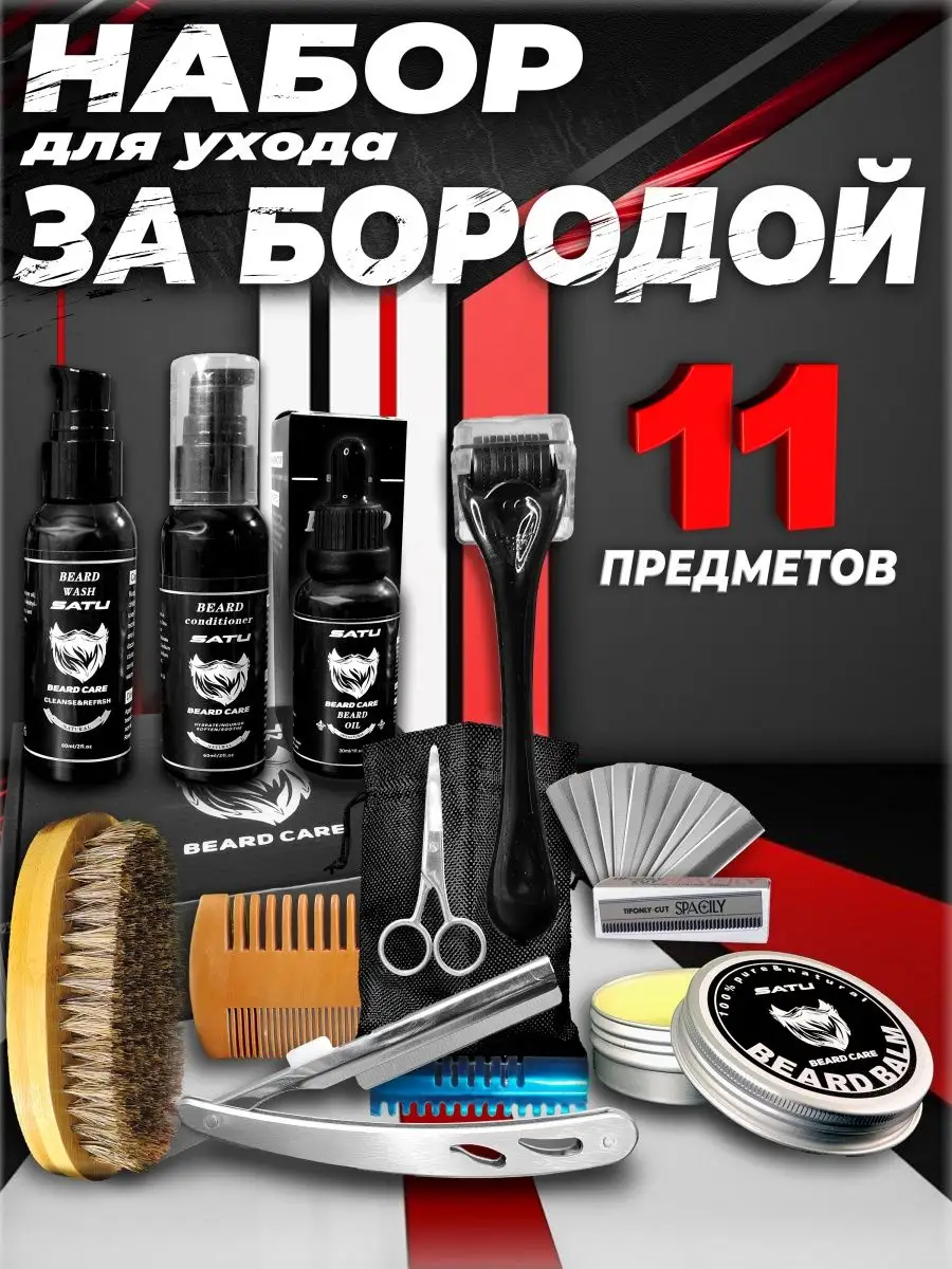 Комплектация опасная бритва; Шампунь , кондиционер; воск , масло для бороды; расческа гребень , щётка для бороды , ножницы; мезороллер , 10 лезвий