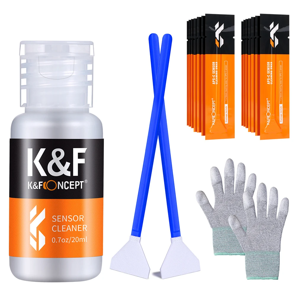 Набор для чистки K & F Concept 24 мм, 16 чистящих палочек, 20 мл, чистящая жидкость, полиуретановые пылезащитные резиновые перчатки для зеркальных камер с полной рамкой