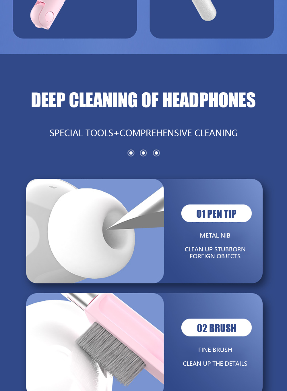 ③ Ручка для чистки наушников 3-в-1 (включая наконечник из силикагеля, флок-губку и мини-щетку высокой плотности)