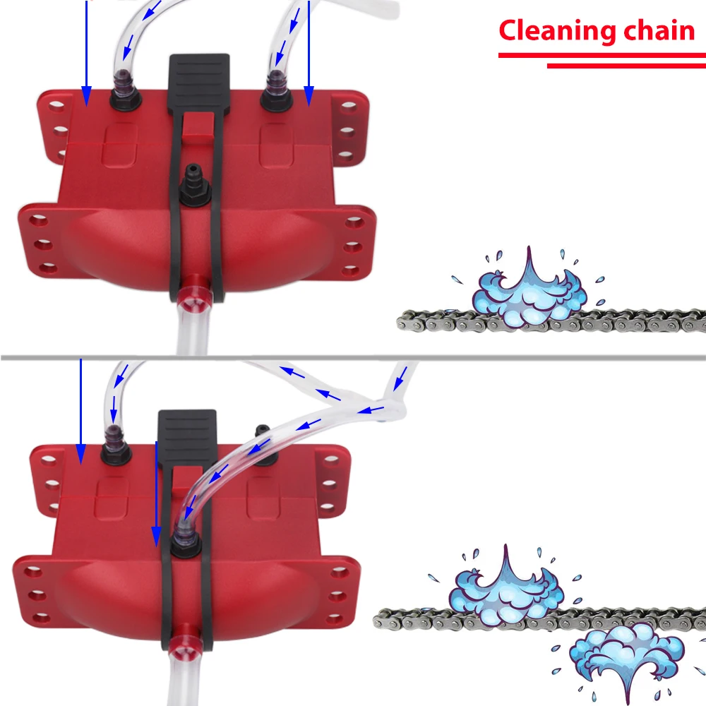 -Cleaning the chain: you can clean the upper part of the chain only by connecting the upper two pipes, or by connecting the upper pipe and the lower pipe for synchronous cleaning up and down.