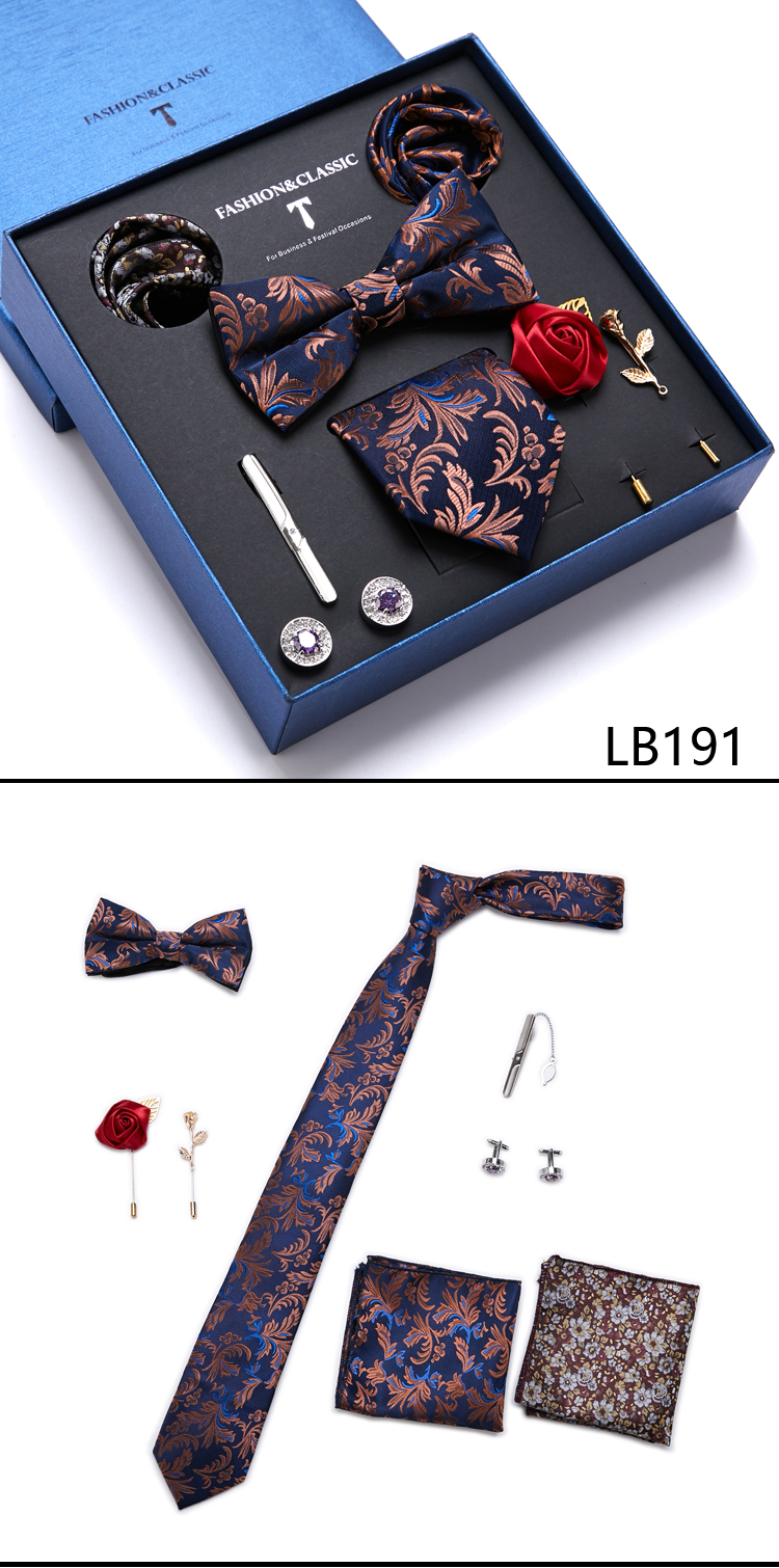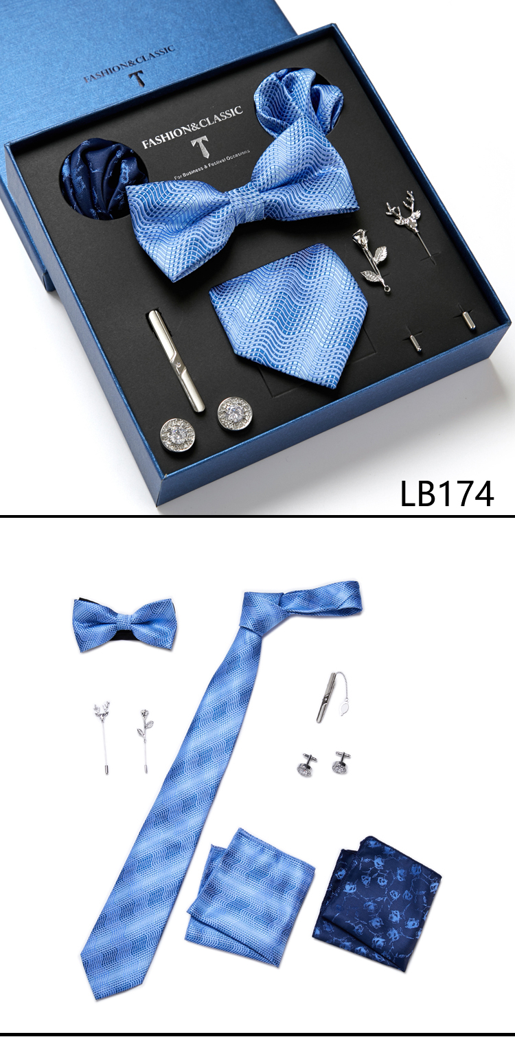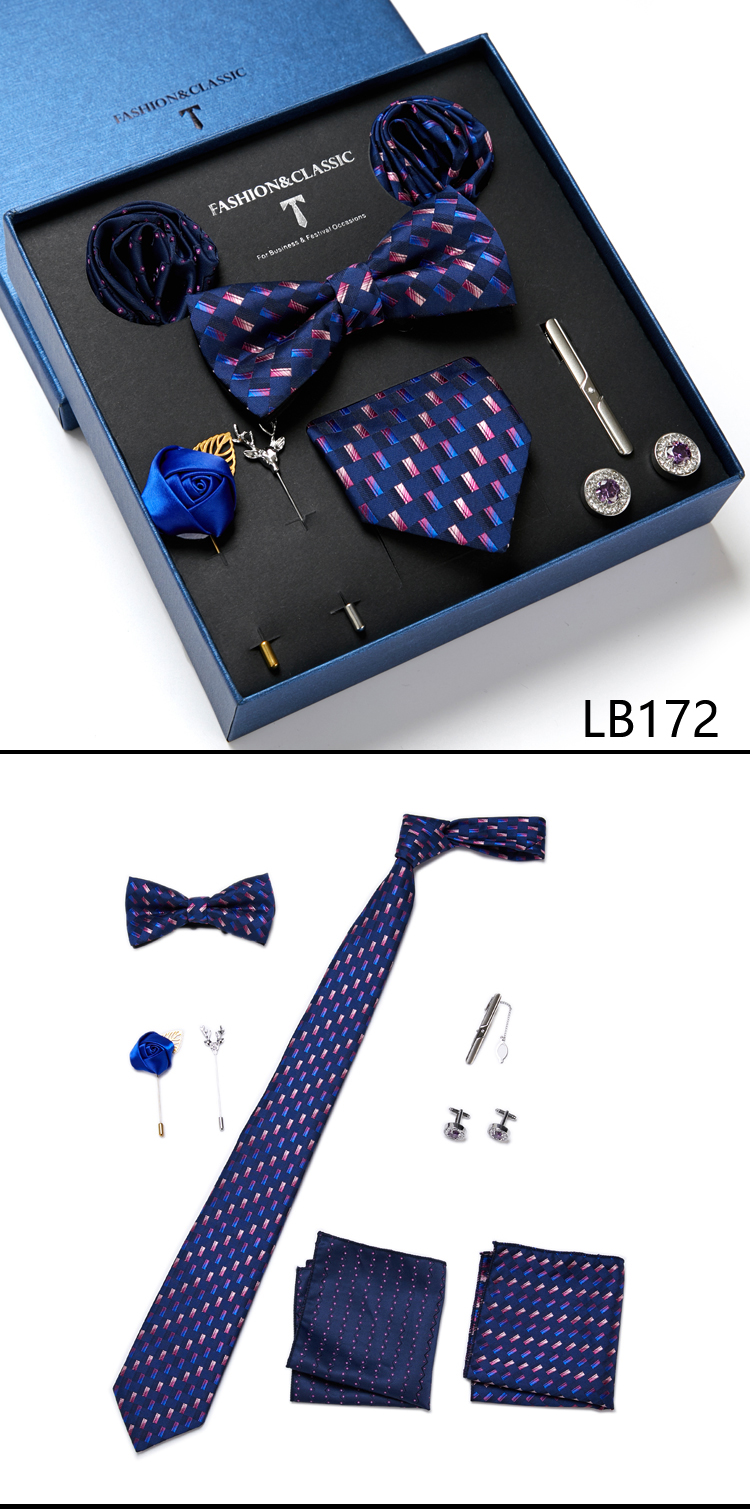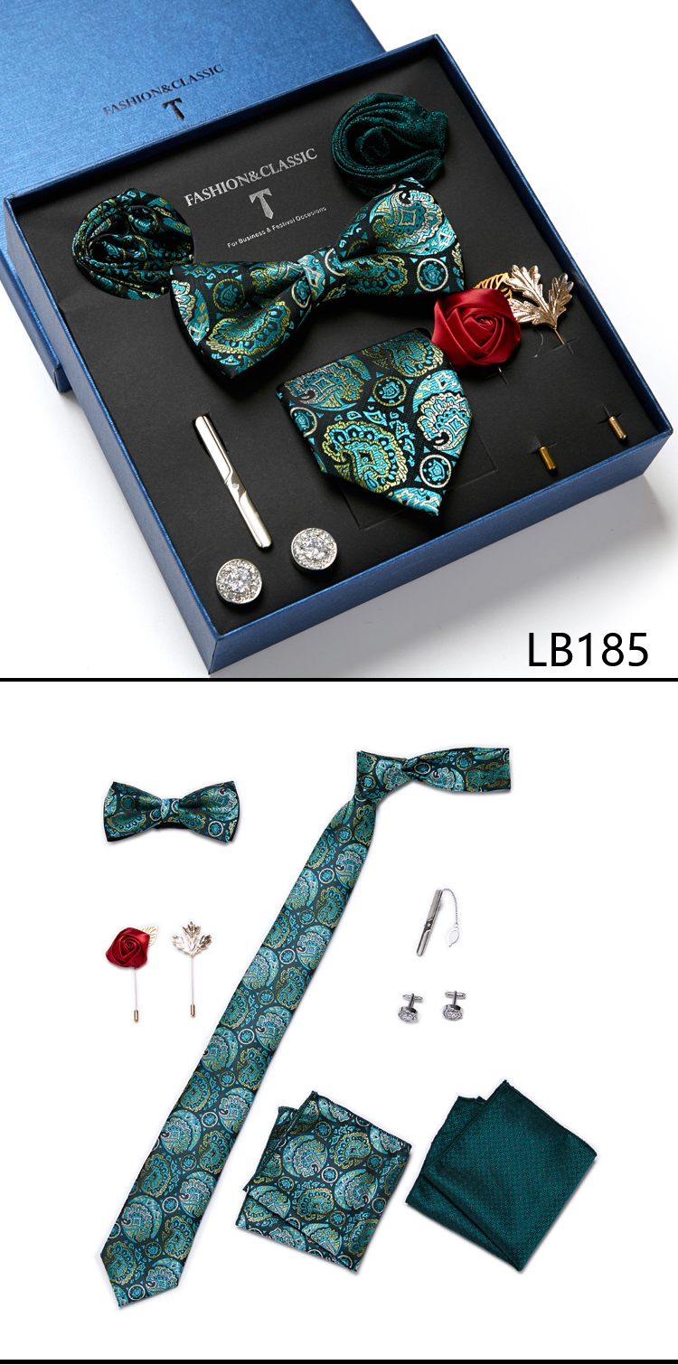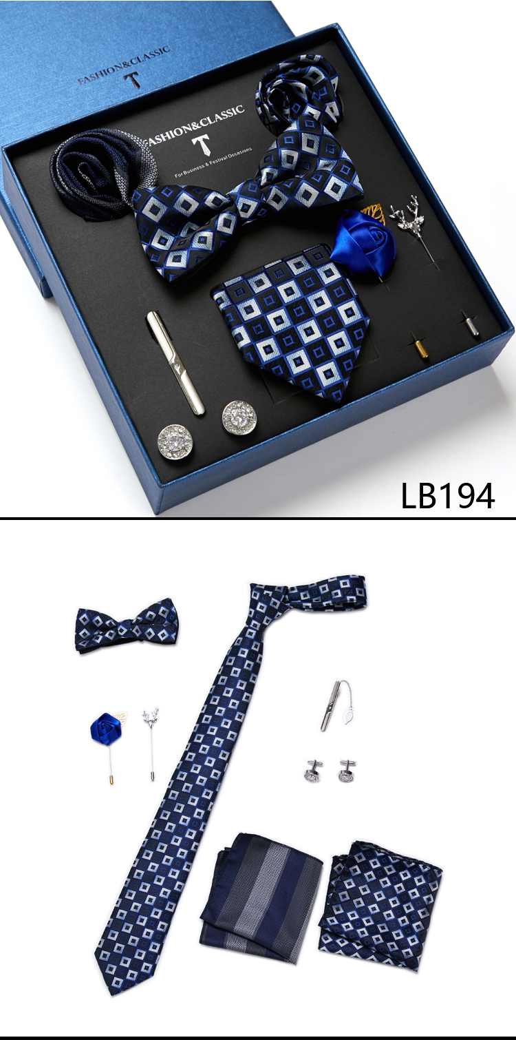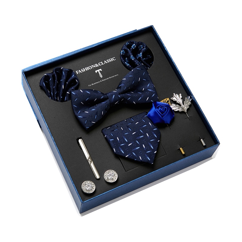 Состояние: всего 8 шт. упакованы в красивую подарочную коробку (включает 1 галстук, 1 галстук-бабочку, 2 Запонки, 1 зажим для галстука, 2 булавки на лацкан и 2 кармана в квадрат)