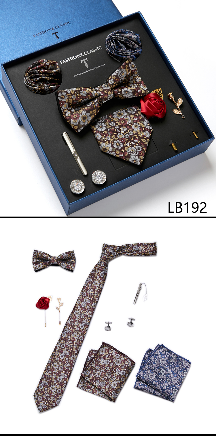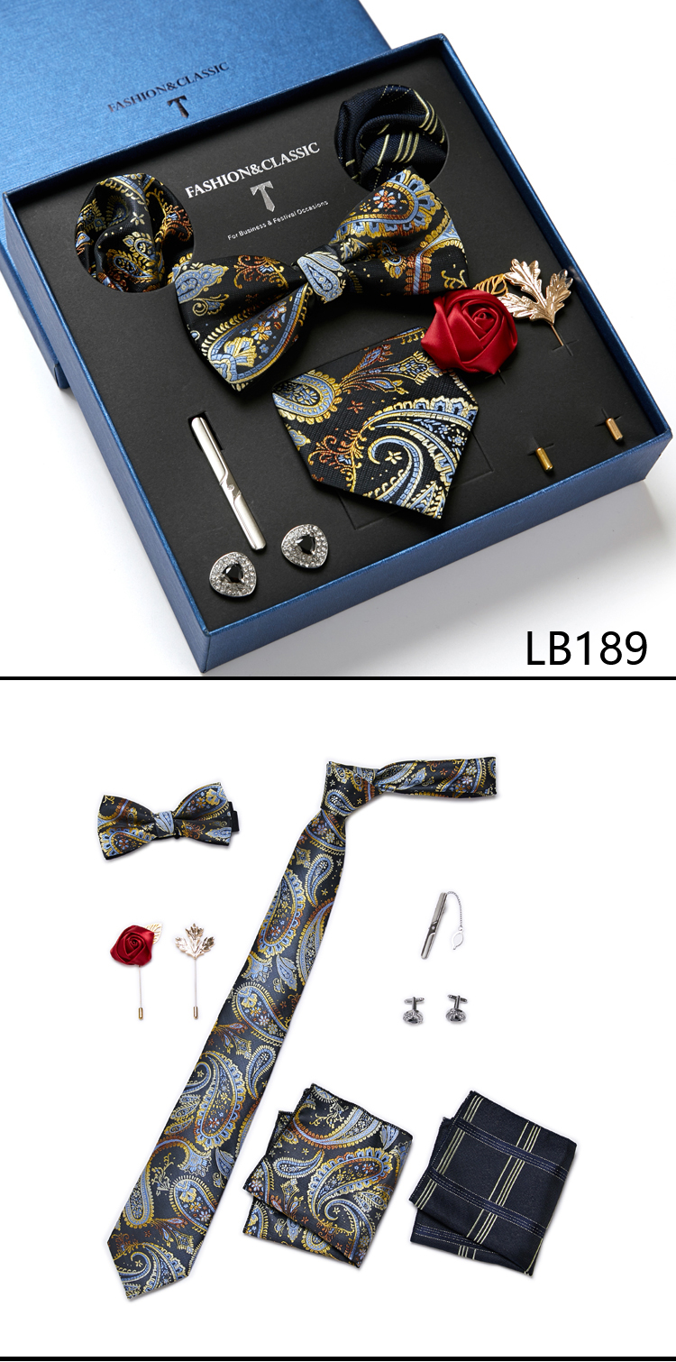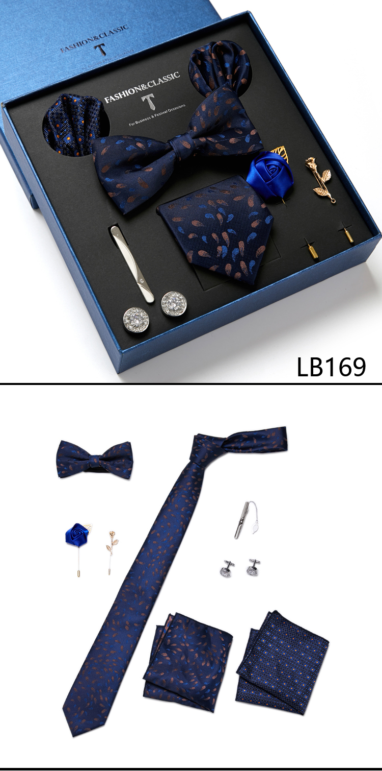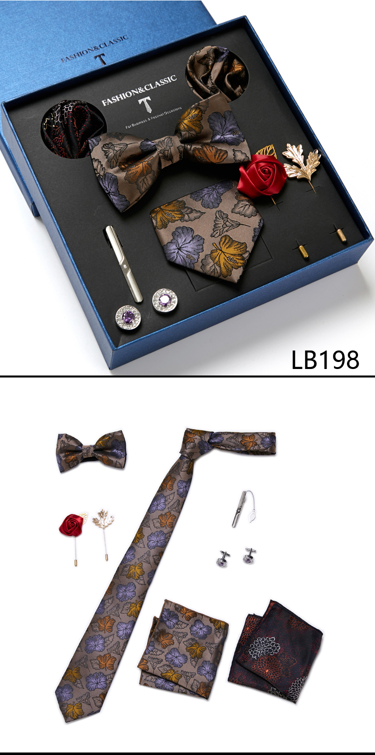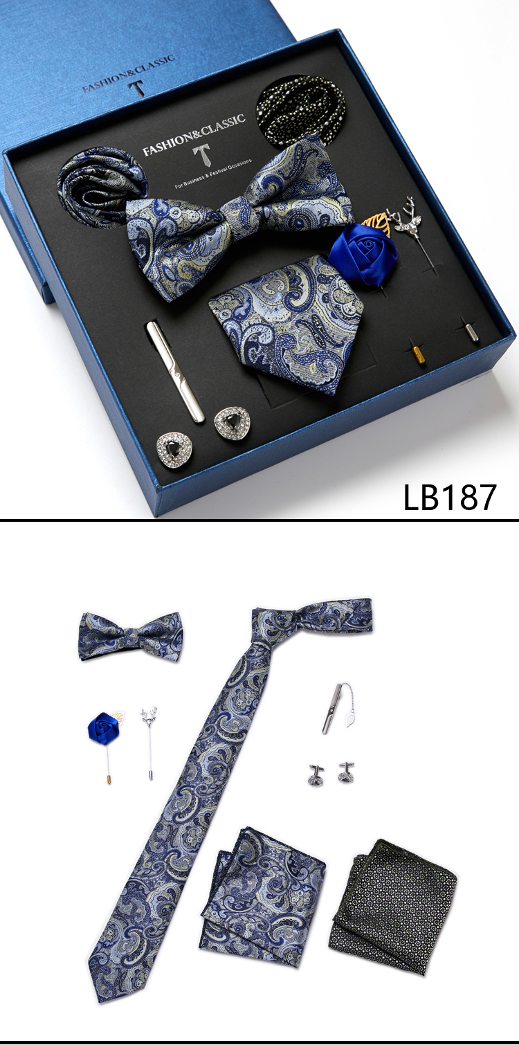 Состояние: всего 8 шт. упакованы в красивую подарочную коробку (включает 1 галстук, 1 галстук-бабочку, 2 Запонки, 1 зажим для галстука, 2 булавки на лацкан и 2 кармана в квадрат)