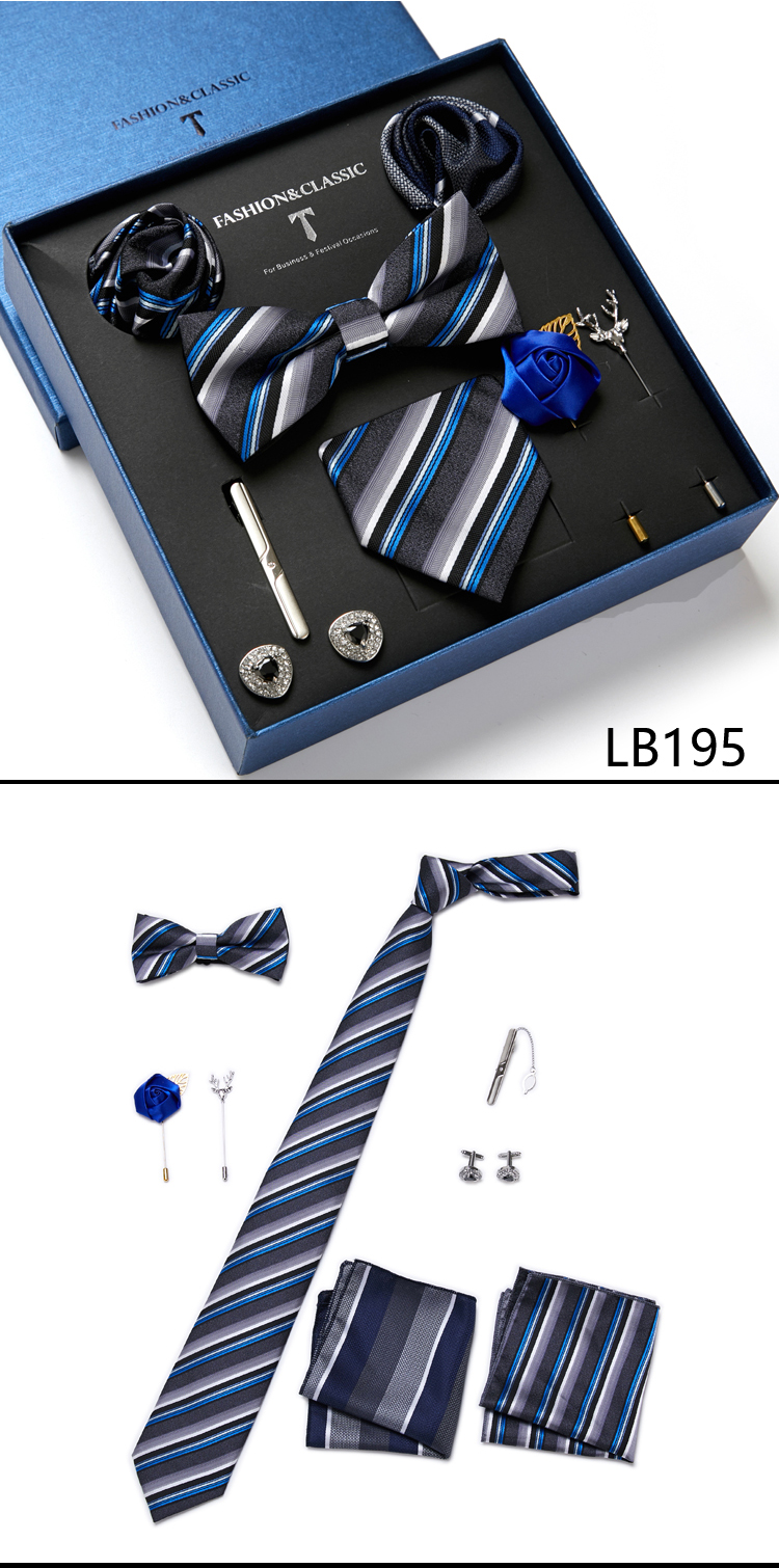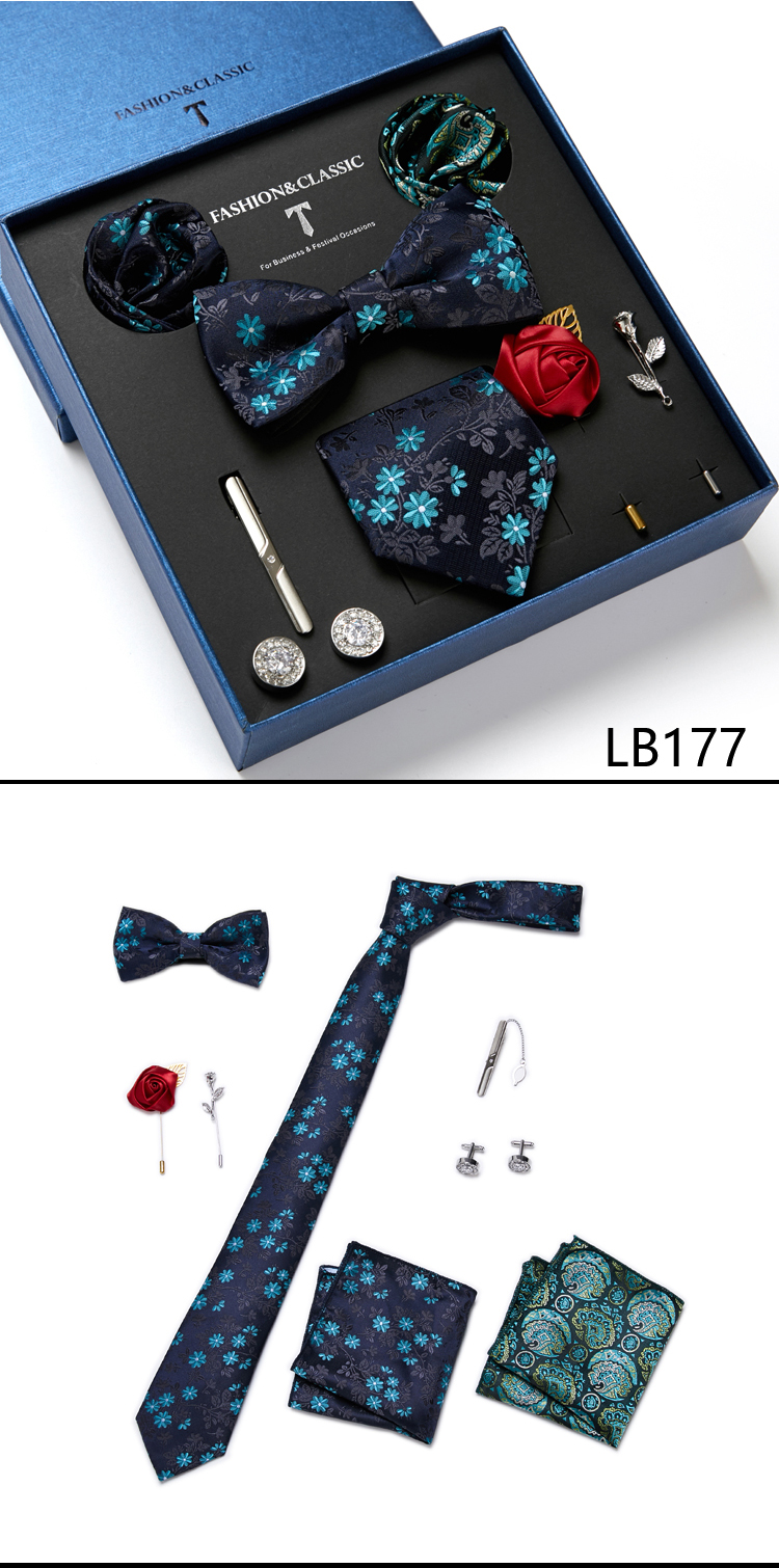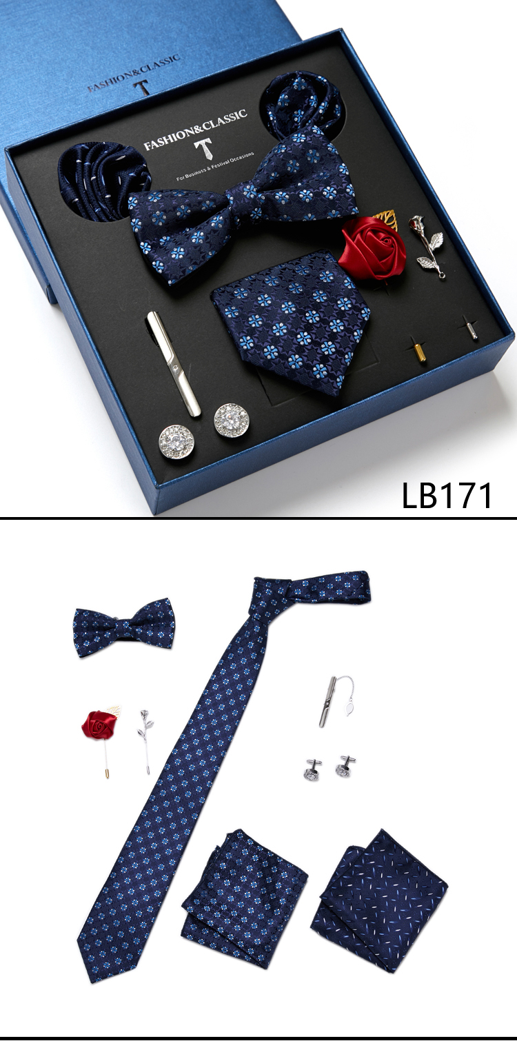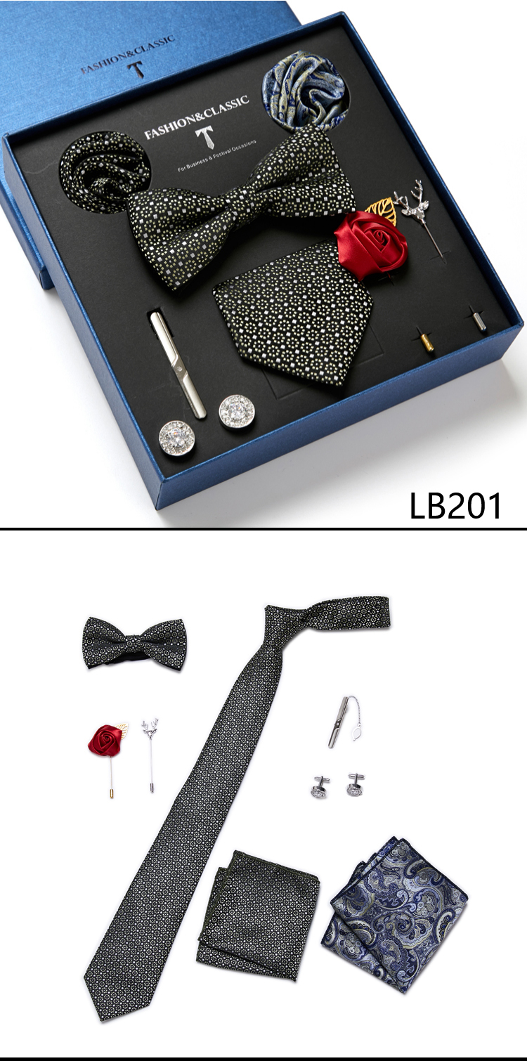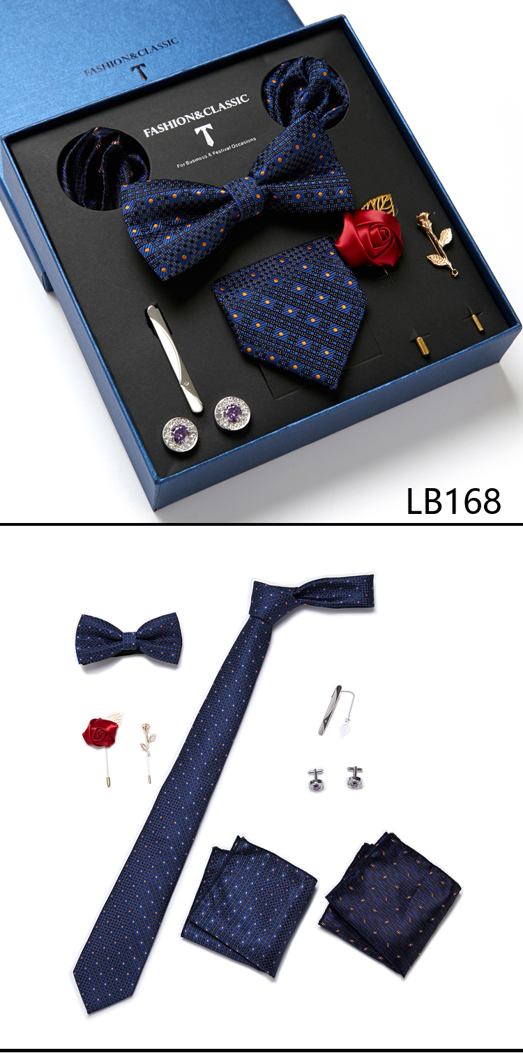 Состояние: всего 8 шт. упакованы в красивую подарочную коробку (включает 1 галстук, 1 галстук-бабочку, 2 Запонки, 1 зажим для галстука, 2 булавки на лацкан и 2 кармана в квадрат)