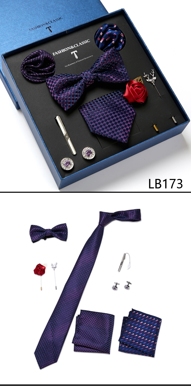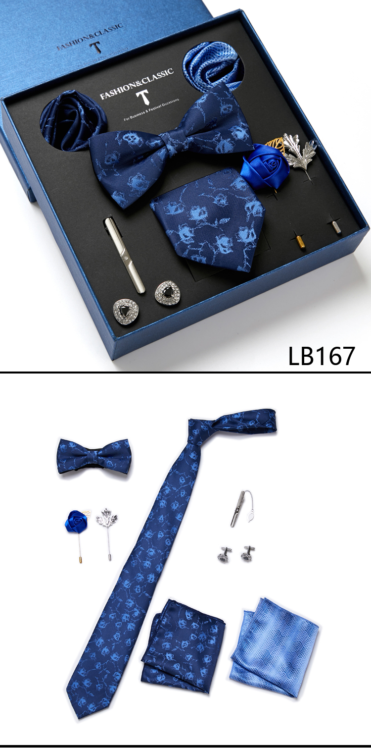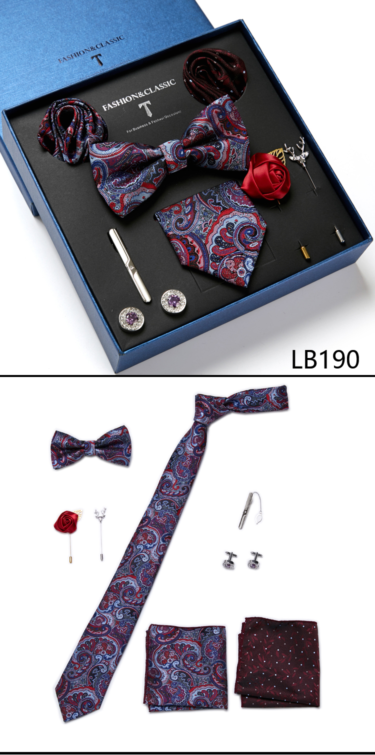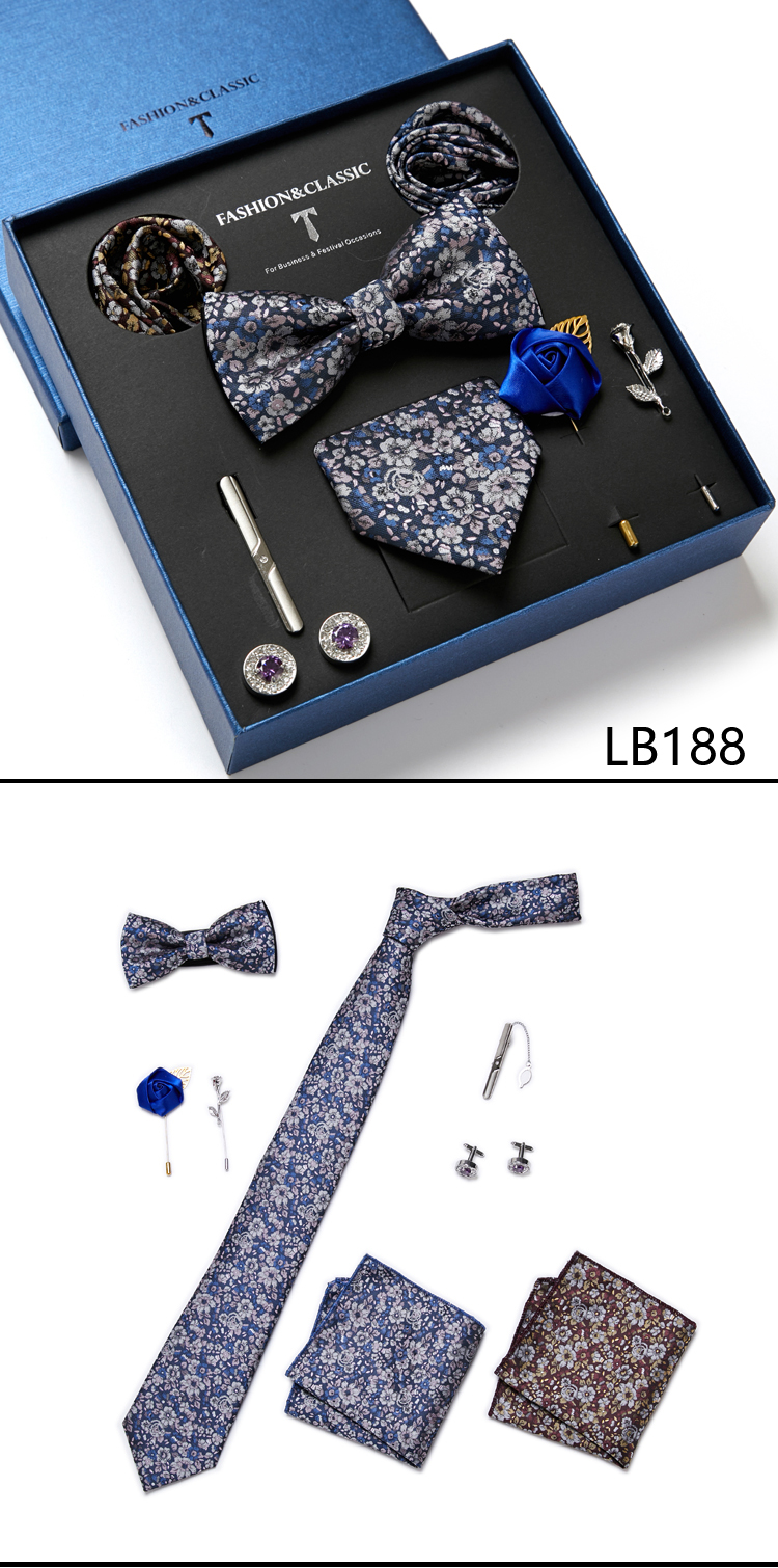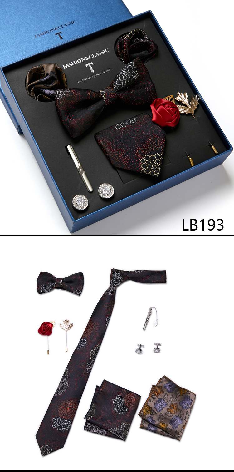 Состояние: всего 8 шт. упакованы в красивую подарочную коробку (включает 1 галстук, 1 галстук-бабочку, 2 Запонки, 1 зажим для галстука, 2 булавки на лацкан и 2 кармана в квадрат)
