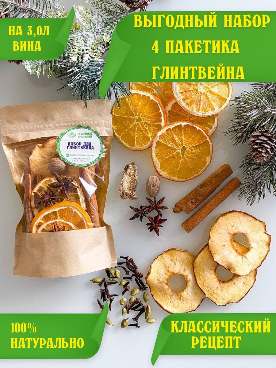 Описание: Глинтвейн является самым популярным новогодним напитком в Европе и все больше и больше завоевывает любовь и в России. Наш набор для приготовления глинтвейна способен подарить вам незабываемый вечер, проведенный в компании с близкими людьми. Наш набор специй для приготовления глинтвейна будет очень необычным небольшим подарком или презентом коллегам, друзьям, маме, папе, бабушке, дедушке, девушке, парню на Новый год, Рождество, 23 февраля, 8 марта, без повода, просто так. На сегодняшний день существует множество рецептов приготовления этого горячительного напитка из вина, мы выбрали более классический рецепт, в котором сочетаются все лучшие вкусовые качества этой смеси. В набор мы помимо специй положили цельные сушеные дольки Апельсиновых и яблочных чипсов, которые придадут пикантности напитку. На пакете специй написан подробный рецепт приготовления в домашних условиях. 1 набора хватит на 1 бутылку вина.(0,75л). Так же наш набор можно приготовить и на основе натурального сока.