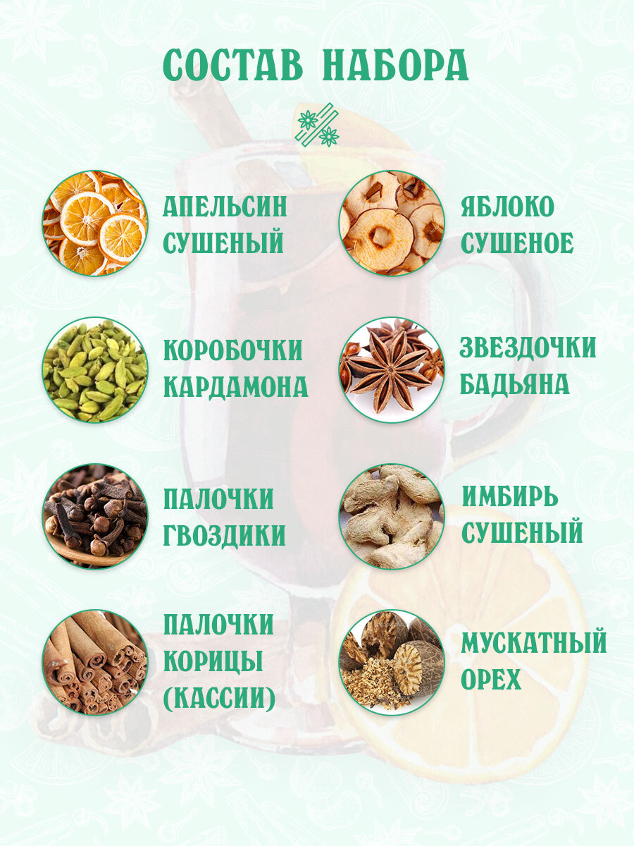 Апельсин сушеный, яблоко сушеное, коробочки кардамона, палочки гвоздики, звездочки бадьяна, имбирь сушеный, палочки корицы (кассии), мускатный орех.