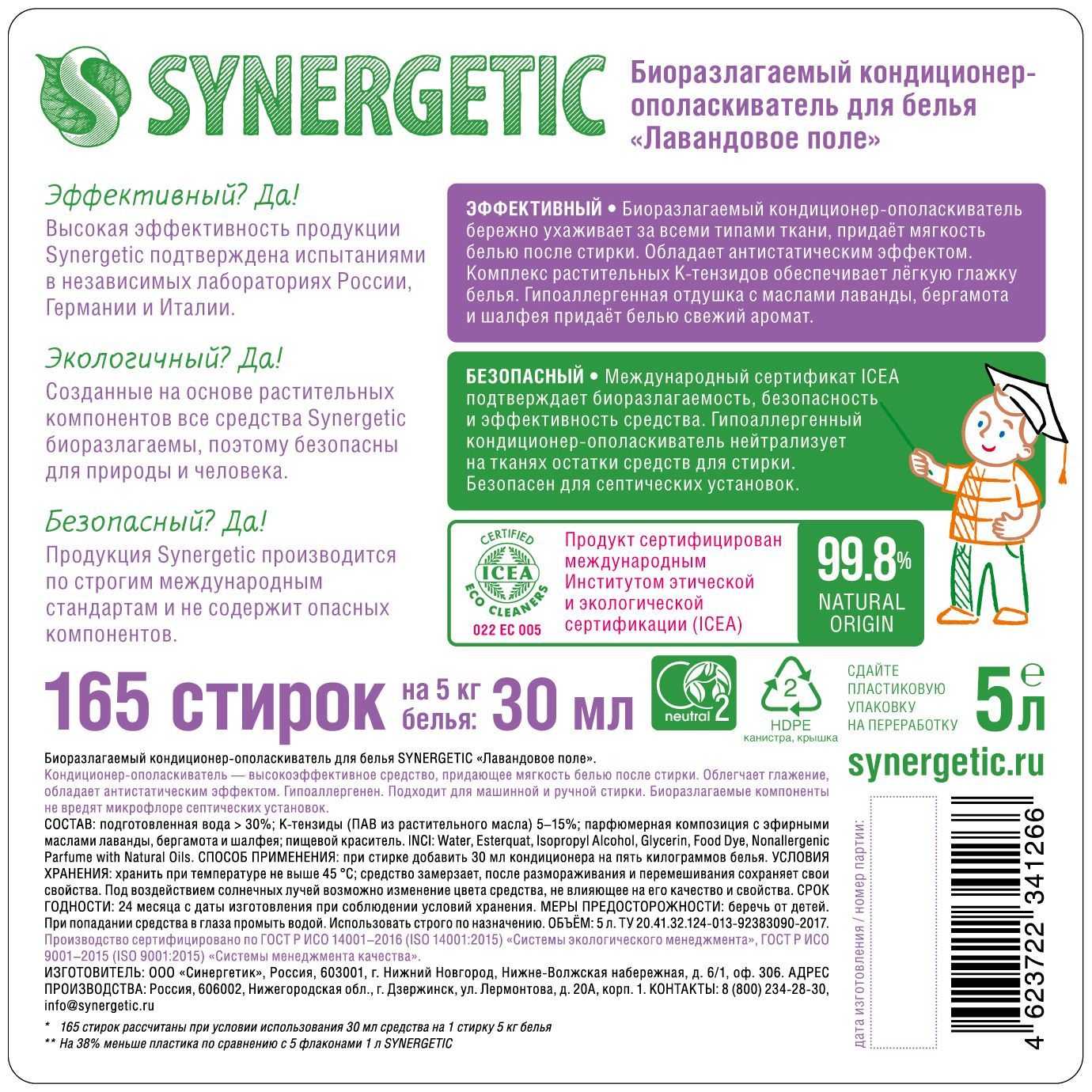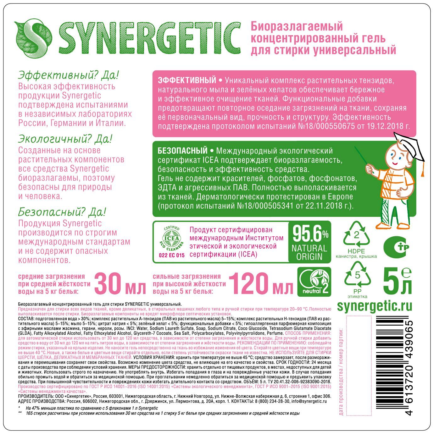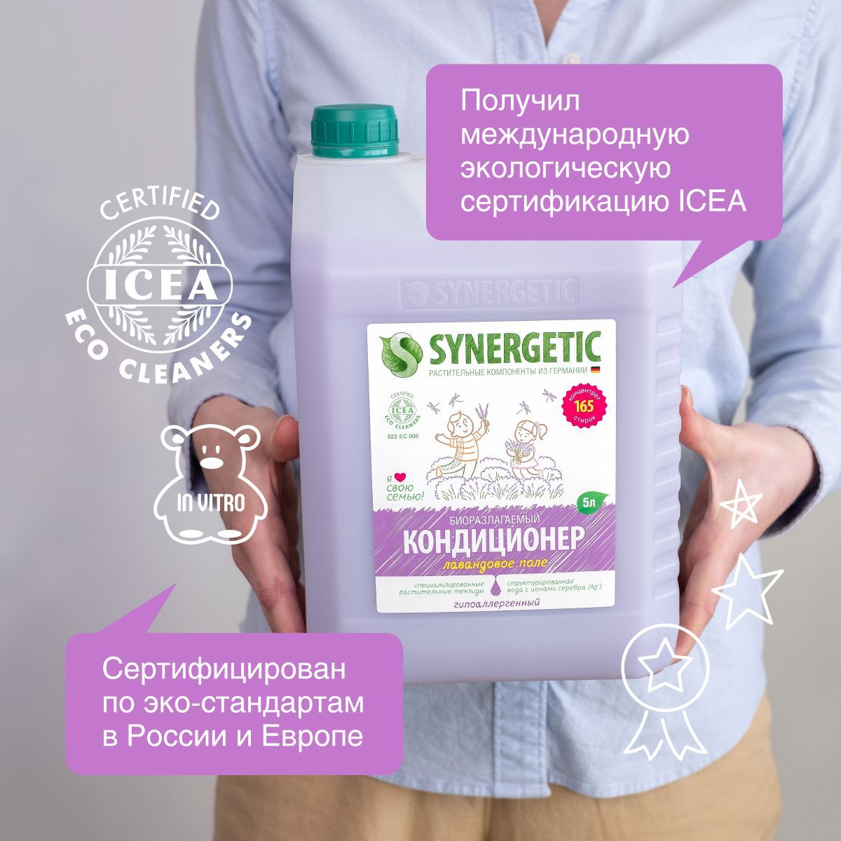 • ОписаниеЧистота, свежесть и мягкость одежды — это то, что создает ощущение комфорта. С гелем для стирки SYNERGETIC любое белье неизбежно станет чистым. О его мягкости, нежном аромате и антистатическом эффекте на ткани позаботится кондиционер для белья. На одну стирку потребуется всего 30 мл геля для стирки и столько же кондиционера.Запаса средств хватит на 5,5 месяцев ежедневной стирки! Не только экологичный, но и экономичный выбор для всей семьи. Экосредства SYNERGETIC гипоаллергенные, а значит, не вредят человеку. И биоразлагаемые, а значит, безопасны для природы. Созданы на основе растительных компонентов из Германии и получили экологическую сертификацию в России и Европе.Большой объём средств — большая экономия! Заказать набор SYNERGETIC выгоднее, чем каждое средство отдельно. Помимо скидки вас ждет полноразмерный подарок-сюрприз.Состав набора экологичных средств:- SYNERGETIC для стирки всех видов тканей, 5л- SYNERGETIC кондиционер для белья «Лавандовое поле», 5л- Подарок-сюрприз!