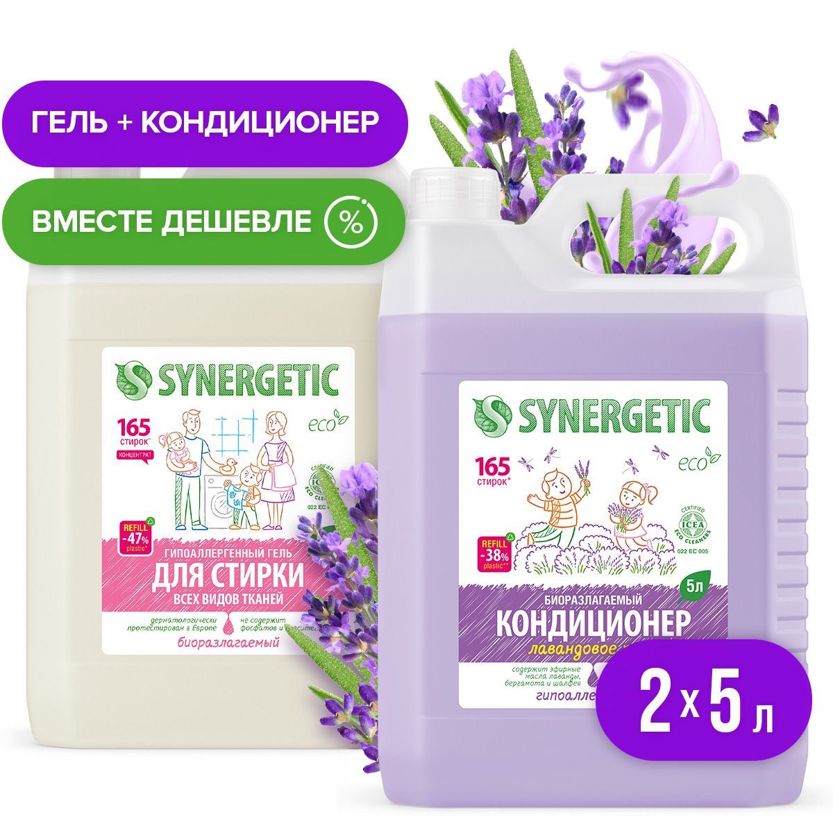 Набор для стирки SYNERGETIC Гель универсальный 5л + кондиционер Лавандовое поле 5л + ПОДАРОК