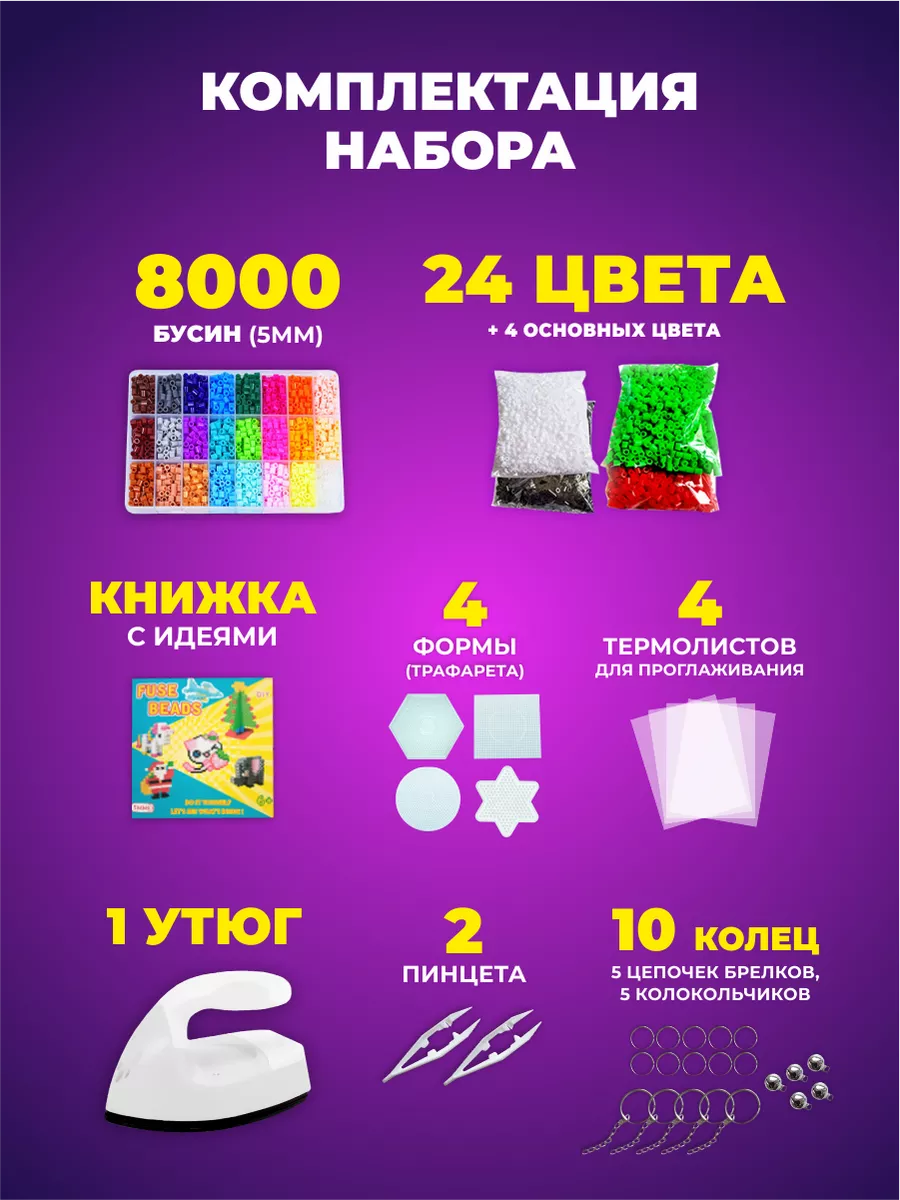 Комплектация книга с идеями -1 шт; Утюг - 1шт; трафарет - 4шт, термолист - 4шт, пинцет - 2шт; кольцо - 10шт, цепочка для брелка - 5шт, колокольчик - 5шт; набор бусин 24 цвета - 8000