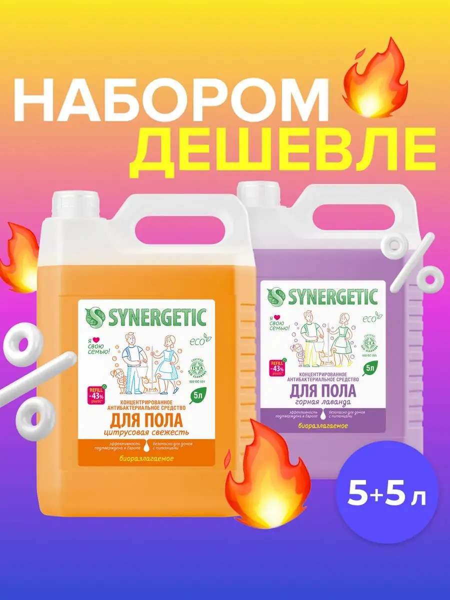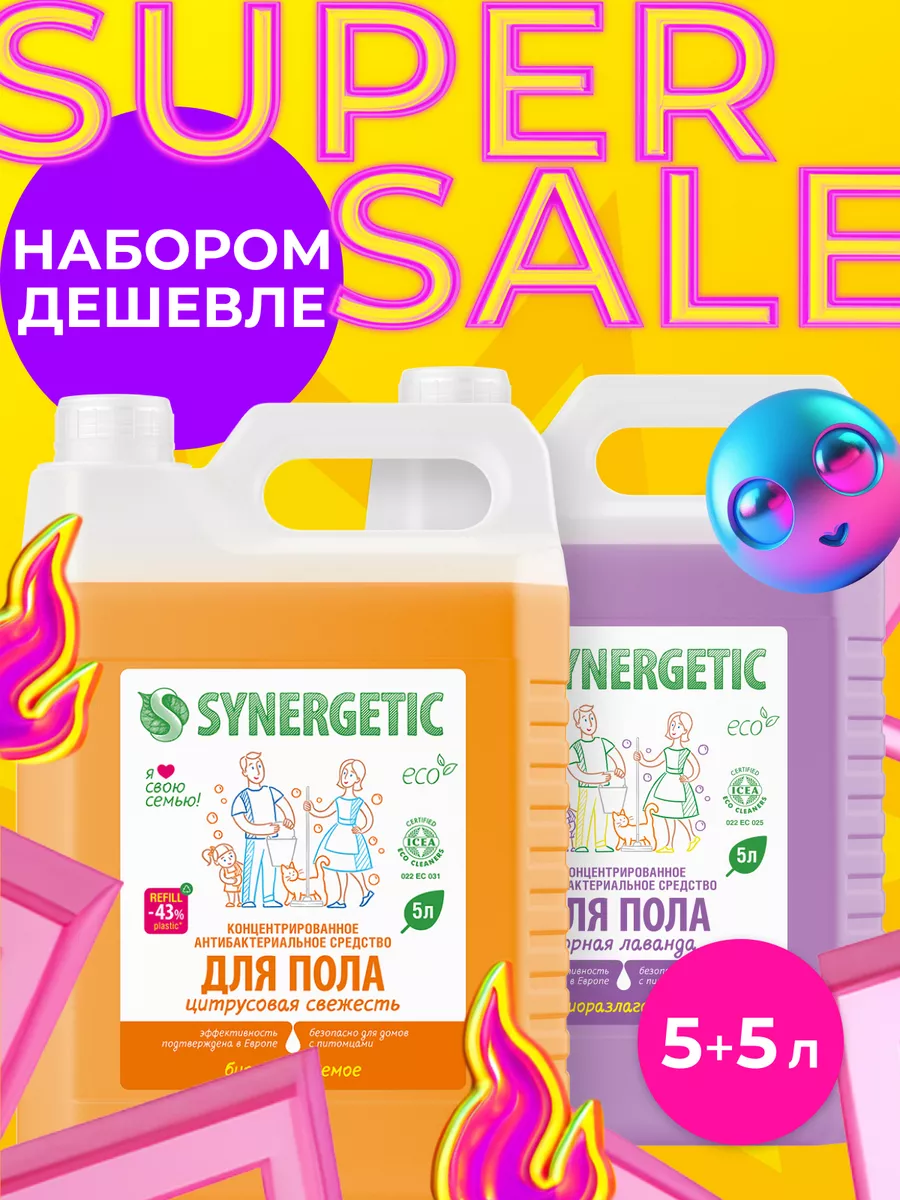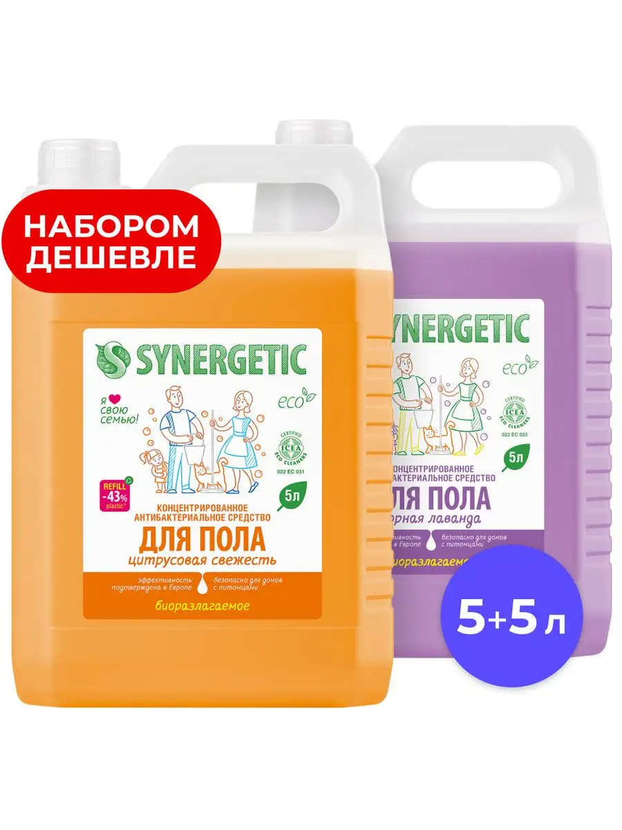 Описание: Горная лаванда: Биоразлагаемое концентрированное средство с антибактериальным эффектом SYNERGETIC "Горная лаванда" – универсальное средство для ежедневной и генеральной уборки пола и других поверхностей: столов, стен, потолка. Уникальный комплекс растительных тензидов эффективно удаляет загрязнения и неприятные запахи даже в холодной воде. Комплекс зеленых хелатов предотвращает повторное оседание загрязнений на поверхности. Подходит для металла, стекла, дерева. Гипоаллергенная отдушка на основе эфирных масел лаванды, бергамота и шалфея оставляет легкий и приятный аромат. Международный экологический сертификат ICEA подтверждает биоразлагаемость, безопасность и эффективность средства. Оно не требует смывания, не оставляет разводов на поверхности, подходит для уборки в детских комнатах и учреждениях, а также безопасно для домов с питомцами. Цитрусовая свежесть: Биоразлагаемое концентрированное средство с антибактериальным эффектом SYNERGETIC "Цитрусовая свежесть" – универсальное средство для ежедневной и генеральной уборки пола и других поверхностей: столов, стен, потолка. Уникальный комплекс растительных тензидов эффективно удаляет загрязнения и неприятные запахи даже в холодной воде. Комплекс зеленых хелатов предотвращает повторное оседание загрязнений на поверхности. Гипоаллергенная отдушка на основе эфирных масел лимона, петитгрейна, лайма и лемонграсса оставляет легкий и приятный аромат. Международный экологический сертификат ICEA подтверждает биоразлагаемость, безопасность и эффективность средства. Оно не требует смывания, не оставляет разводов на поверхности, подходит для уборки в детских комнатах и учреждениях, а также безопасно для домов с питомцами. Средство можно использовать с разными видами швабр. Набор для уборки полов - Выгода от SYNERGETIC! Покупка средств набором – экономия семейного бюджета!