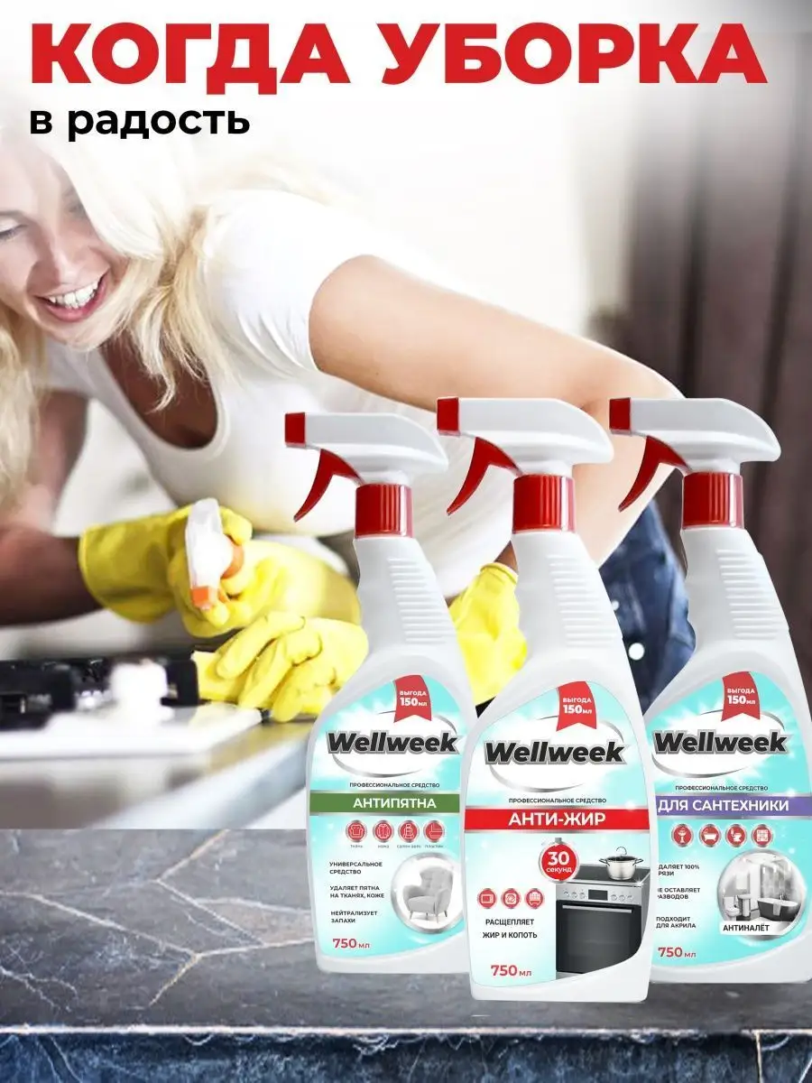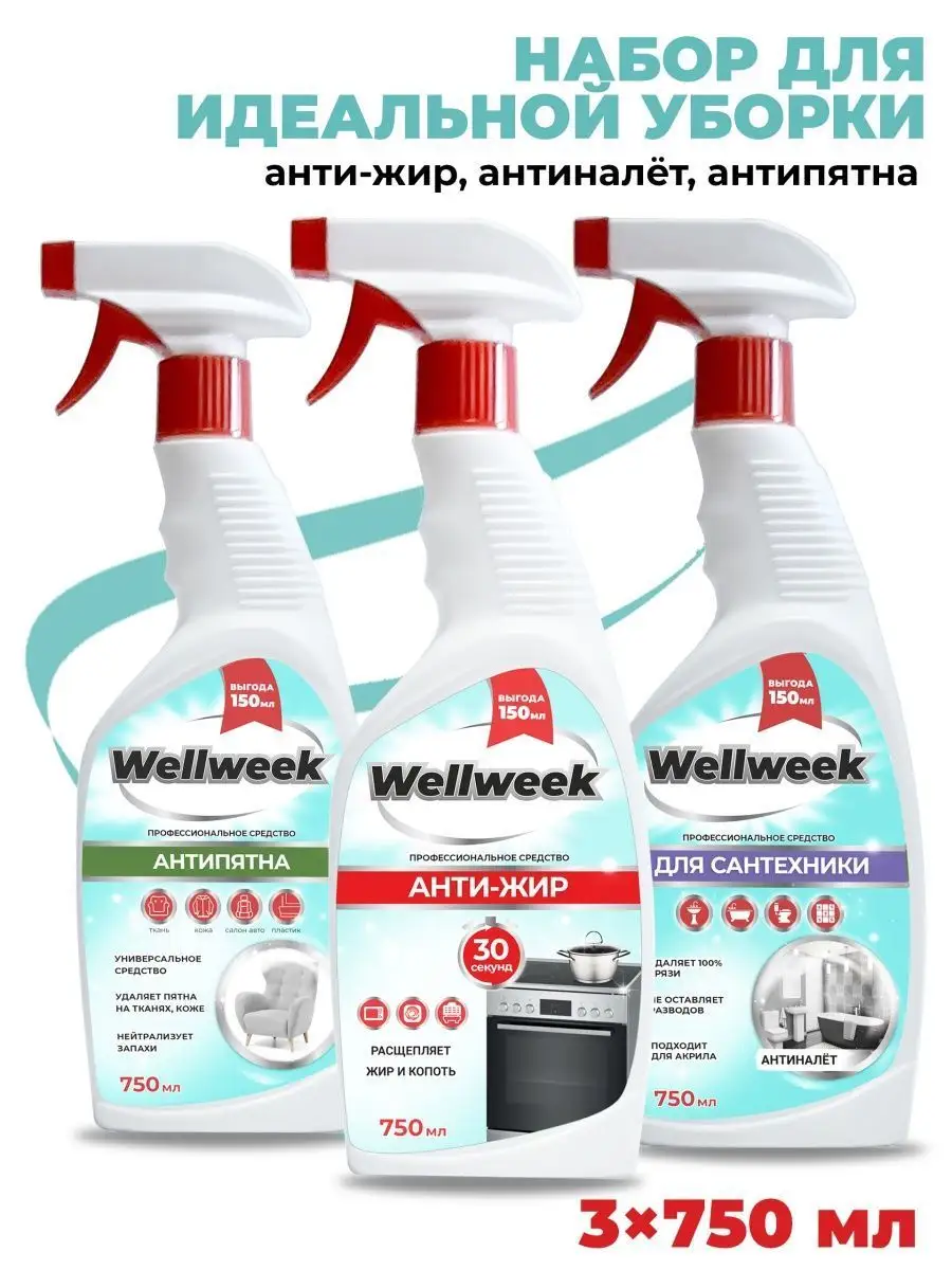 Описание: Набор средств бытовой химии для уборки от WellWeek. В состав набора входит:Универсальное чистящее средство Антиналет, для ванны 750 млУниверсальное чистящее средство для кухни Антижир 750 мл удаляет жир, нагар, копоть и пригоревшую пищу с эмалированных, хромированных поверхностей, изделий из стекла, нержавеющей стали, фаянса, фарфора. Позволяет эффективно очистить сковородку, кухонную газовую плиту, газовую решетку,фритюрницу, подходит для гриля, духовки, микроволновки в домашних условиях.Средство для уборки Антипятна 750 мл спрей широкого спектра действия, для ковров, мебели, ковролина, дивана, подошвы обуви. Средство можно использовать не только для чистки ковров, мебели, а также очистить ткань и как пятновыводитель. Универсальный подарок для Вашего дома. Бытовая химия ВеллВик - это высокоэффективные средства для ванны, для сантехники, для кухни, для пола, для стёкол, из которых можно составить отличный набор для уборки вашего дома. Антиналет спрей состав: ≥30% вода; ≥5%, но <15% органическая кислота; <5%: нПАВ, полиакрилаты, д-лимонен Антижир спрей состав: ≥30% вода; ≥5%, но <15% щелочь; <5%: нПАВ, органические растворители, аПАВ, фосфонаты, д-лимонен Антипятна состав: ≥30% вода; <5%: соль ЭДТА, нПАВ, аПАВ, консервант, органический растворитель, д-лимонен