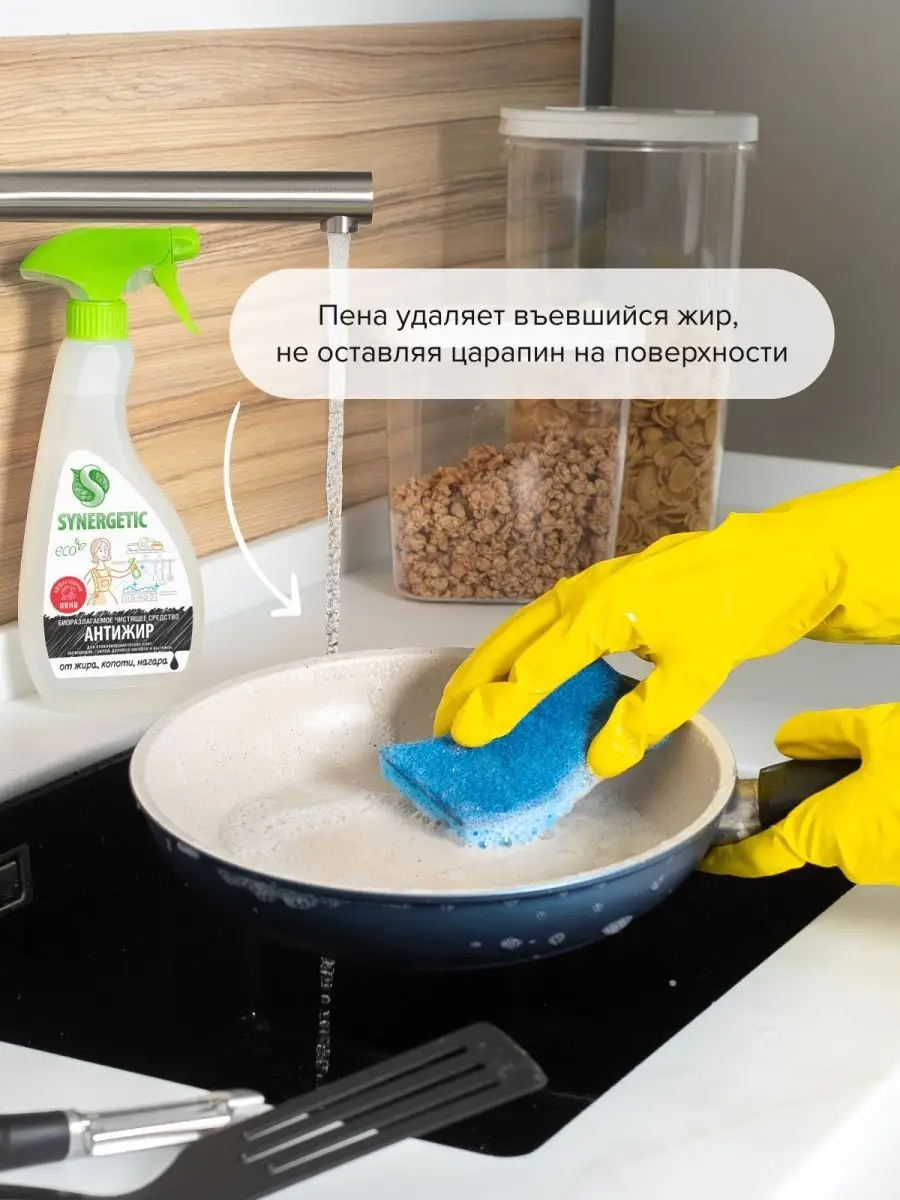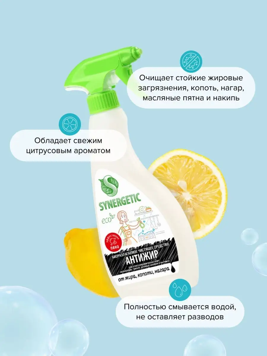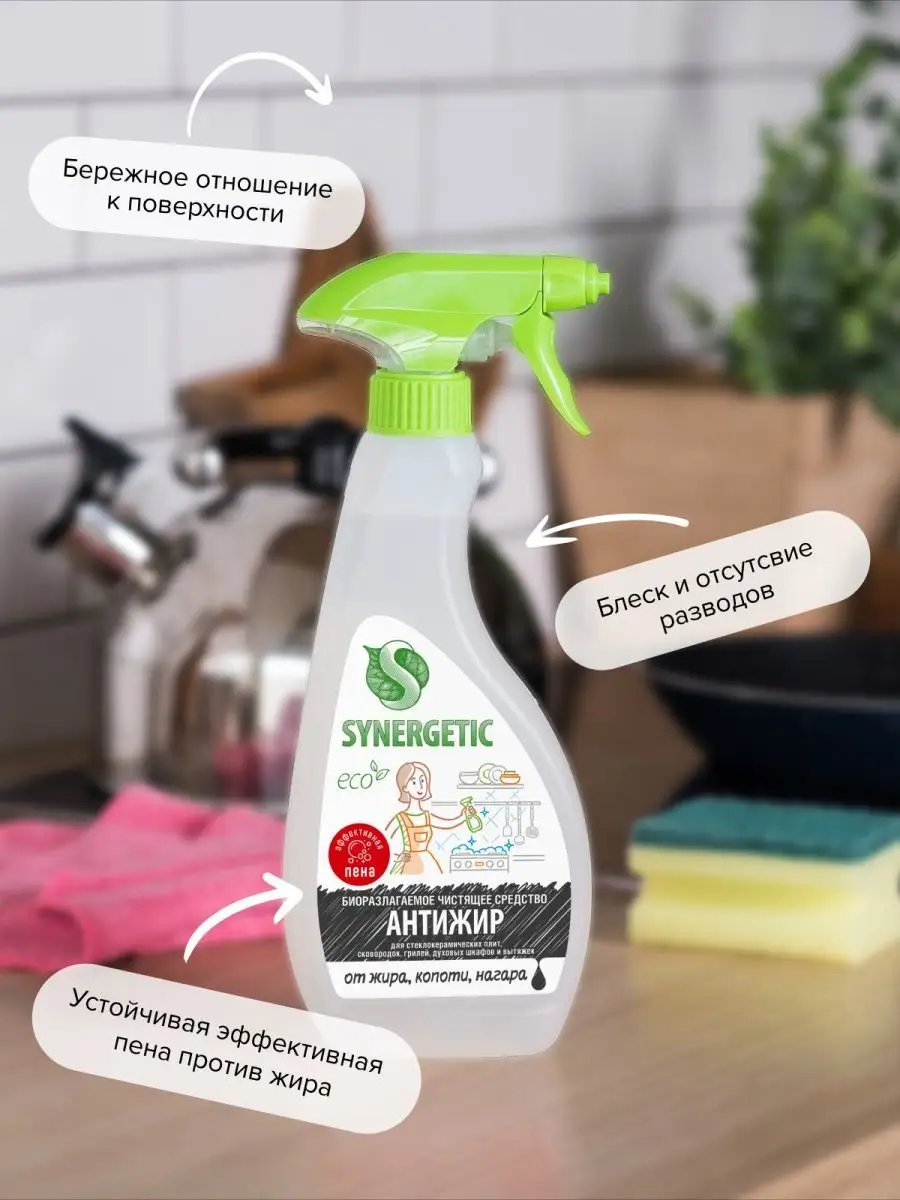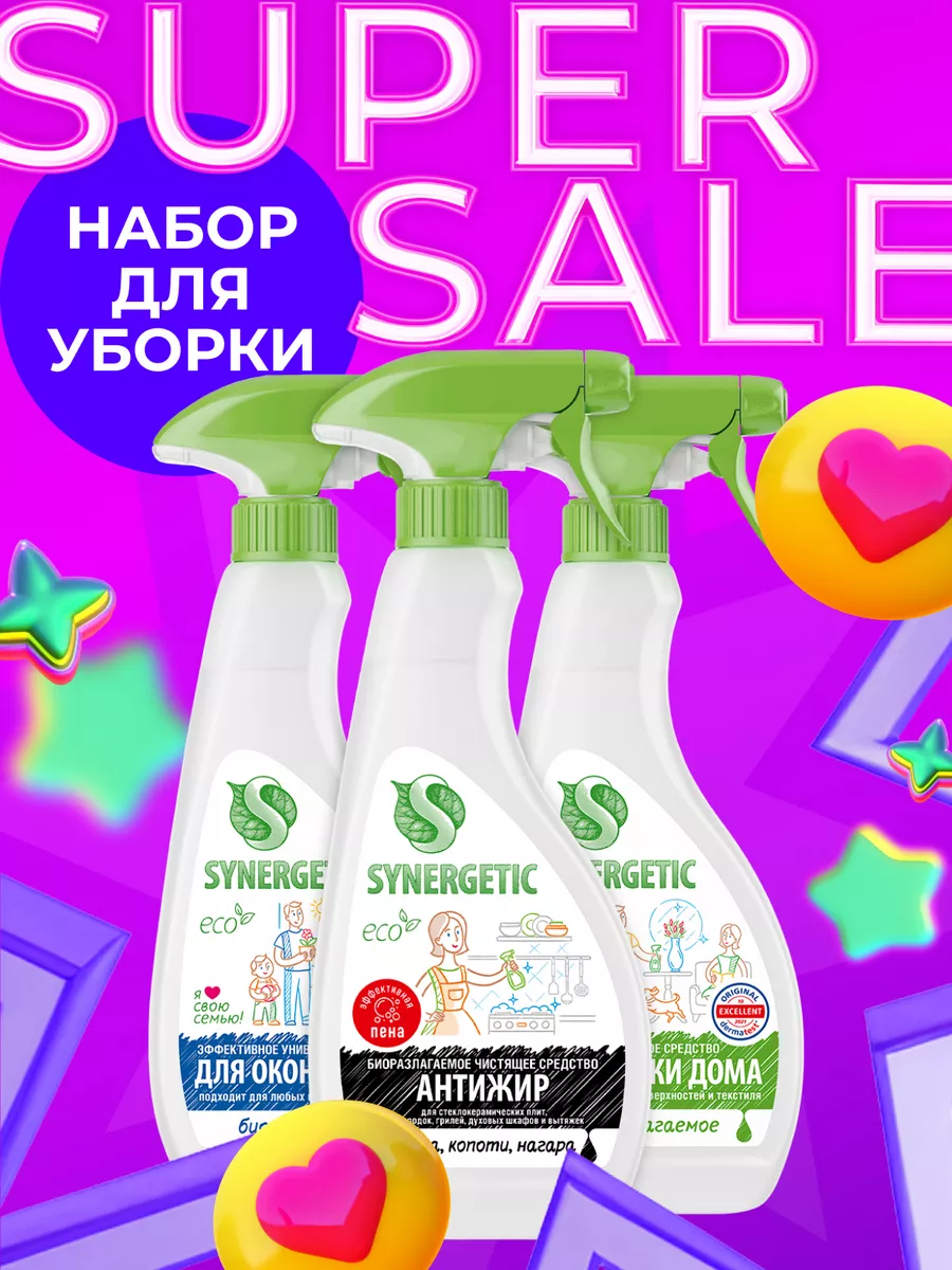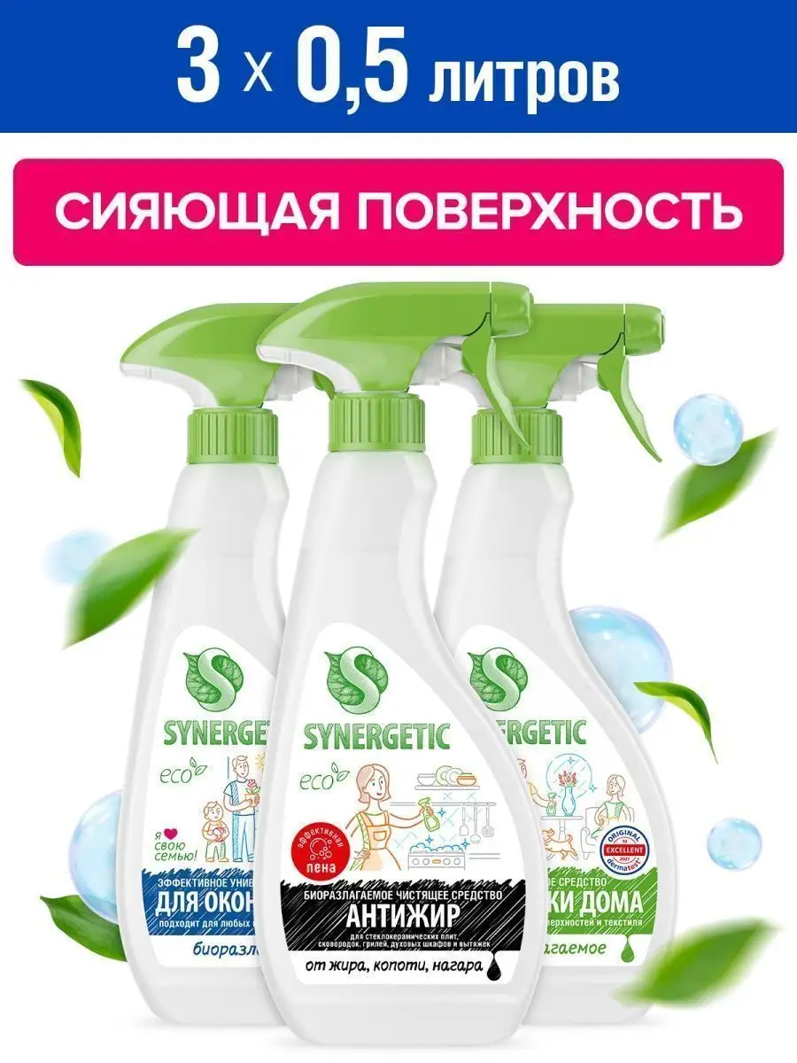 Описание: Набор для уборки SYNERGETIC «Сияющая поверхность» состоит из трех средств с триггером (курковым распылителем) объёмом 500 мл. В набор для уборки входит: 1. Средство биоразлагаемое для мытья стекол, зеркал и бытовой техники SYNERGETIC 0,5 л – 1 шт. Эффективное и универсальное средство для бережного очищения стеклянных, зеркальных и любых других глянцевых поверхностей. Не требует смывания, улучшает светопроницаемость стекла. Комплекс растительных Н-тензидов и изопропилового спирта высокой степени очистки эффективно очищает стеклянные и глянцевые поверхности без разводов. Средство образует защитную пленку от пыли и грязи, облегчает последующее мытье поверхностей. Гипоаллергенная отдушка на основе эфирных масел придает средству и очищенным поверхностям приятный цветочный аромат. Безопасно для септических установок. 2. Биоразлагаемое средство для удаления жира и нагара SYNERGETIC 0,5 л – 1 шт. Высокоэффективное щелочное средство для удаления жира, нагара и копоти с плит и других кухонных поверхностей. Комплекс биоразлагаемых растительных тензидов и соды справляется с органическими загрязнениями за считанные минуты. Кальцинированная сода создает необходимую для расщепления пятен щелочную среду и растворяет масложировые компоненты загрязнений. Универсальное чистящее средство для уборки дома, любых поверхностей и текстиля SYNERGETIC 0,5 л – 1 шт. Многофункциональное чистящее средство, которое быстро и легко удаляет любые виды загрязнений. Эффективно устраняет неприятные запахи и обезжиривает поверхность, защищая ее от повторного загрязнения. Спрей подходит для любых видов поверхностей. Легко смывается, не оставляя разводов, и придает блеск. Универсальное чистящее средство широкого спектра действия. Универсальный подарок для Вашего дома. Бытовая химия SYNERGETIC – это высокоэффективные средства для ванны, сантехники и кухни, пола и стёкол, из которых можно составить отличный набор для уборки и заботы за вашим домом. Средства SYNERGETIC безопасны для септических установок.