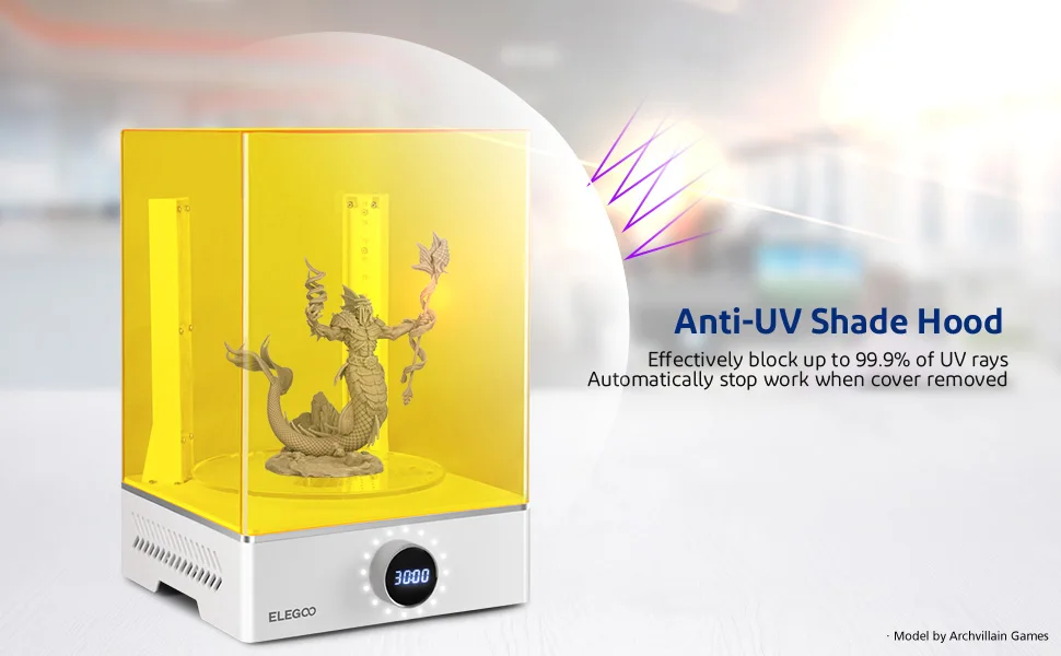 The transparent cover of the curing machine can block up to 99.9% of ultraviolet rays to improve resin solidification rate and protect your eyesight during curing process.