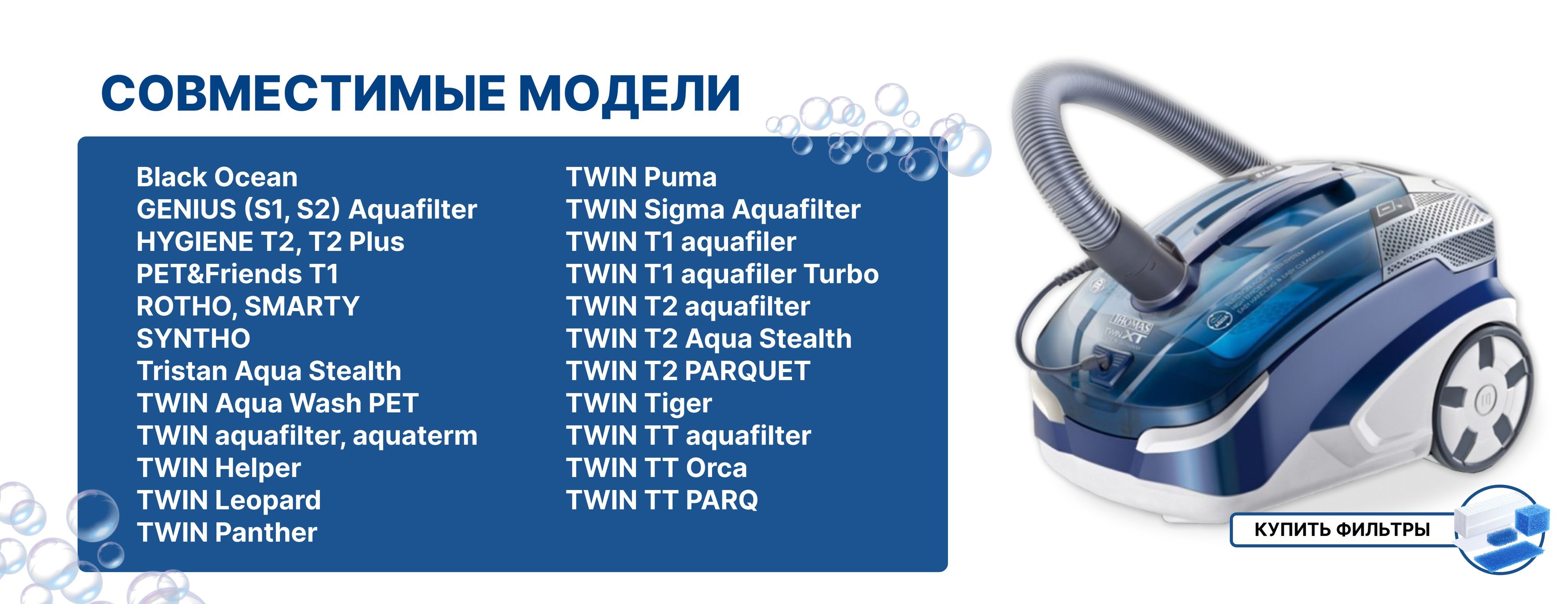 Описание: Набор фильтров FTH 16 предназначен для моющих пылесосов THOMAS TWIN. В комплект входит моторный фильтр, фильтр HEPA, микрофильтр и два фильтра аквасистемы. Согласно рекомендациям производителя, не моющиеся фильтры для пылесоса нужно менять не реже одного раза в 6 месяцев, а также при снижении мощности всасывания пылесоса. Универсальный фильтр для моющего пылесоса томас задерживает до 100% пыли и аллергенов. Аква фильтр не пропускает даже самые мелкодисперсные частички, что обеспечивает безопасную и надежную фильтрацию. Бытовой фильтр совместим с моделями: Black Ocean, GENIUS (S1, S2) Aquafilter, HYGIENE T2 и Т2 Plus, PET&Friends T1, ROTHO, SMARTY, SYNTHO, Tristan Aqua Stealth, твин Aqua Wash PET, TWIN: aquafilter, aquaterm, Helper, Leopard, Panther, Puma, Sigma Aquafilter, T1 aquafiler, T1 aquafiler Turbo, T2 aquafilter, T2 Aqua Stealth, T2 PARQUET, Tiger, TT aquafilter, TT Orca, TT PARQ, tomas