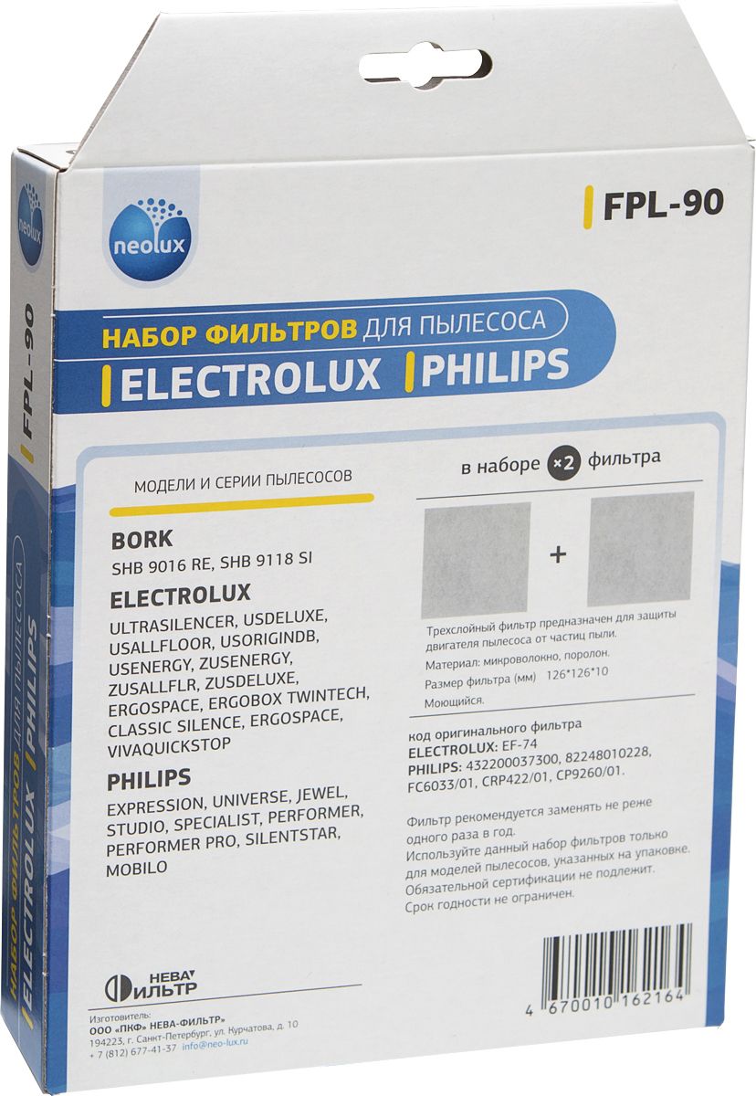 Описание: Фильтр для пылесосов PHILIPS. ELECTROLUX, BORK. Универсальный трёхслойный моторный фильтр NEOLUX FPL-90 предназначен для большого числа моделей пылесосов ELECTROLUX, PHILIPS, BORK. Соответствует артикулу фильтров ELECTROLUX EF-74.