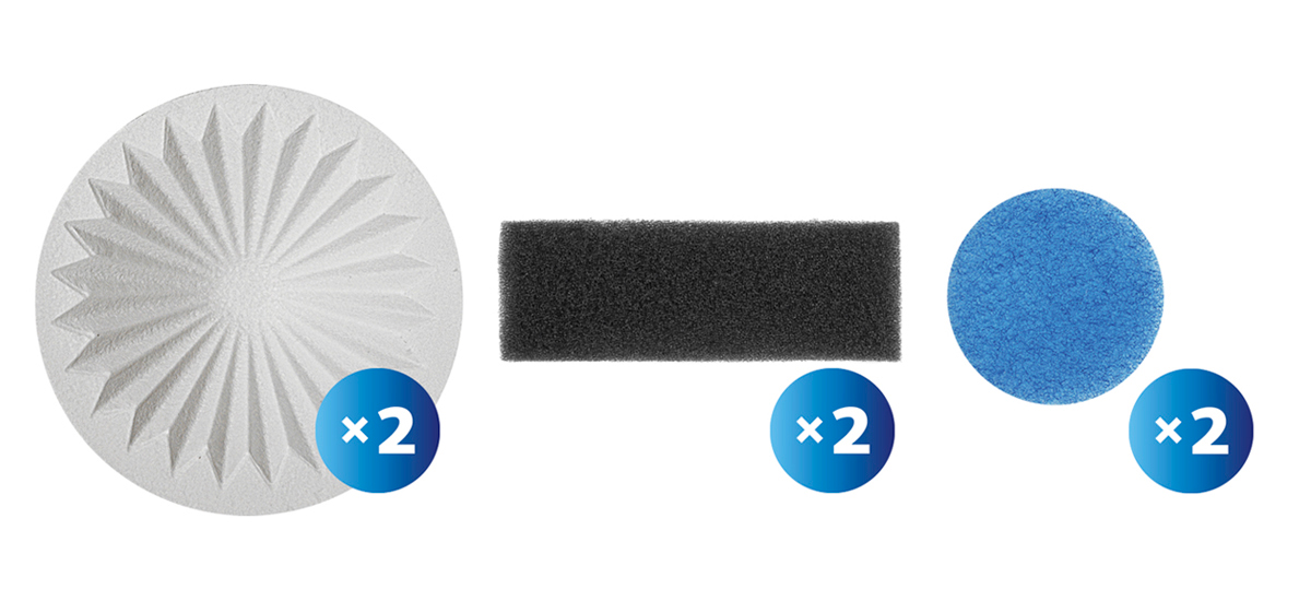 Конусный фильтр- 2 шт, предмоторный фильтр- 2 шт, фильтр тонкой очистки- 2 шт, инструкция