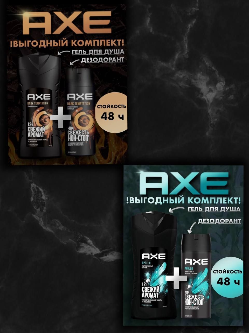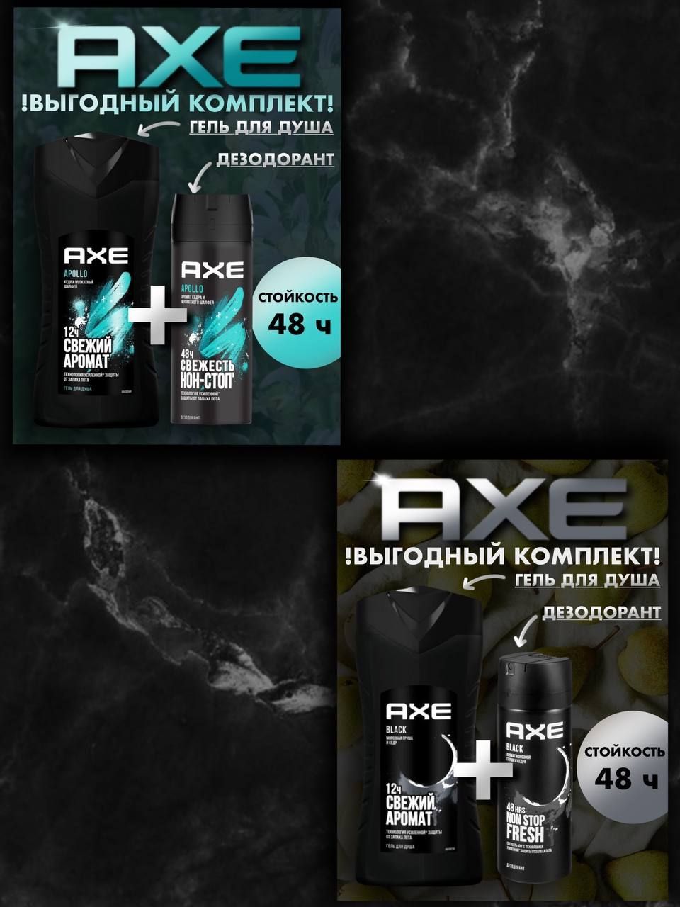 Описание: Гель мужской АХЕ обладает тонким ароматом. Запах долго сохраняется на коже и идеально сочетается с дезодорантами АХЕ. Новая технология 2 в 1. Будь свежим, привлекай ароматом!Гель для душа АХЕ - мужская косметика, которая подарит вам истинное удовольствие и эффективное очищение кожи. Средство гарантирует, что уход за телом будет легким и комфортным. Формула продукта обеспечивает мягкое и глубокое очищение и качественный уход за кожей тела.Гель для душа АХЕ великолепно пенится. Достаточно нанести на мочалку всего несколько капель, чтобы получить густую и объемную пену. После смывания на коже не возникает ощущения мыльности - только свежесть и чистота. Гель для душа АХЕ обеспечивает не только качественный и приятный уход за кожей, но и эффективно смывает бактерии с поверхности кожи. Дезодоранта AXE для настоящих мужчин. Дезодорант защитит Вас от пота и запаха на 48 часов и предаст Вам уверенности в себе на весь день. При использовании антиперспирант не оставляет белых и желтых пятен на одежде. Не оставит равнодушным абсолютно никого,а особенно вашу вторую половинку. Дезодорант Axe пользуется огромным спросом среди мужчин, поэтому мы сделали для Вас комплект, состоящий из двух дезодорантов AXE. Самый популярный мужской бренд в мире, знаменитый своими эксклюзивными ароматами и удивительными рекламными кампаниями. Убедительная просьба перед применением ознакомиться с инструкцией по правильному использованию дезодоранта для мужчин. Избегать попадания в глаза во время использования! Хранить в недоступном от детей месте!