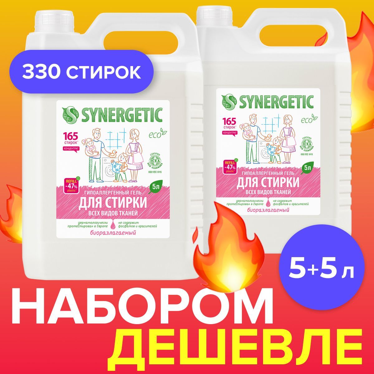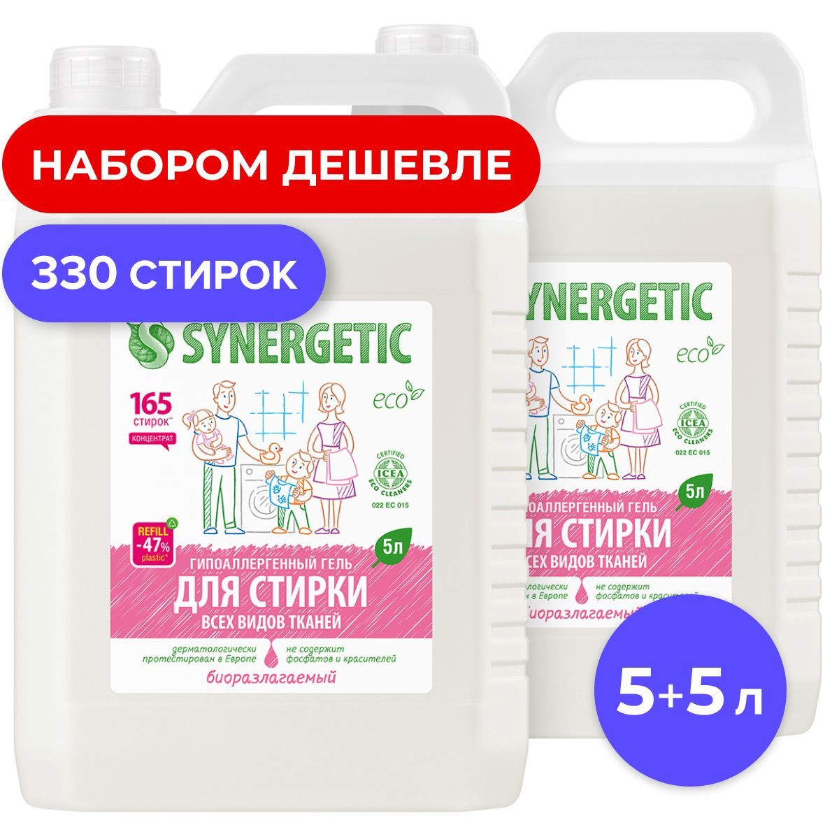 Набор гель для стирки SYNERGETIC универсальный 5л+5л, 330 стирок, концентрат, гипоаллергенный, биоразлагаемый