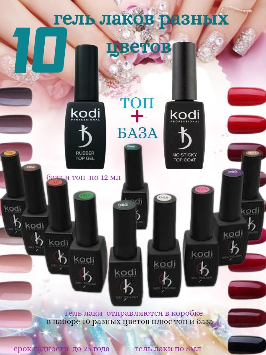 Описание: 10лаков +2(топ и база) Набор гель-лаков. Гель-лак Kodi – это минимум 10 коллекций разных цветов, Среди них есть яркие и пастельные, с глянцевым блеском, разными видами глиттера, витражные. Средства отличаются высокой пигментированностью, стойкостью, в меру густой консистенцией. В нем нет ацетона, спирта, других растворителей, то есть средство имеет достаточную степень безопасности. Он почти не пахнет, имеет удобную для нанесения текстуру. Состав держится на ногтях до 3 недель, но не препятствует их отрастанию, покрытие не трескается. Гель-лаки Коди имеют разную плотность, это зависит от цвета. Светлые обычно нужно наносить в два слоя, иначе получается прозрачное покрытие, хоть и с видимым оттенком. Яркие и темные цвета можно красить в один, но при этом свободный край просматривается. А некоторые гель-лаки не оставляют проплешин только будучи нанесенными в три слоя. Чаще это нюдовые тона. Текстура средств позволяет наносить их тонкими слоями, так что «пирогов» на ногтях после полимеризации не образуется. Лаки хорошо распределяются, но не текут на кожу. Уважаемая (ый) покупательница хотим предупредить, что цвета мы выбираем и ложим сами, мы обещаем, что положим только Топ расцветки без повторов , вы будете довольны и Вас ждет приятный подарок!!!Создавайте классный дизайн в сочетании с любыми гель лаками: кошачий глаз, с блестками, светоотражающими, неоновыми; каучуковыми, глянцевыми и матовыми топами. Хорошо просыхают, не пекут, используйте UV LED лампу. Основа под шеллак и топ - финишное покрытие - в подарок, в некоторых наборах праймер. Идеальный стартовый или подарочный маникюрный набор на Новый год, день рождения или 8 марта