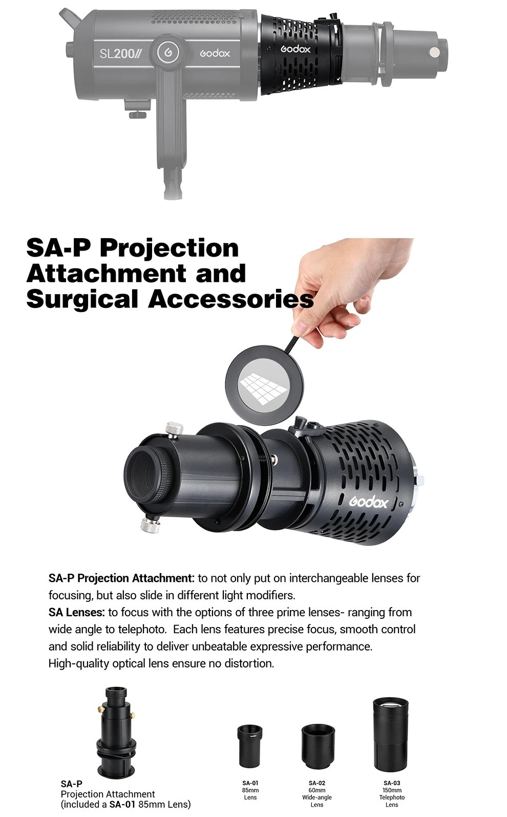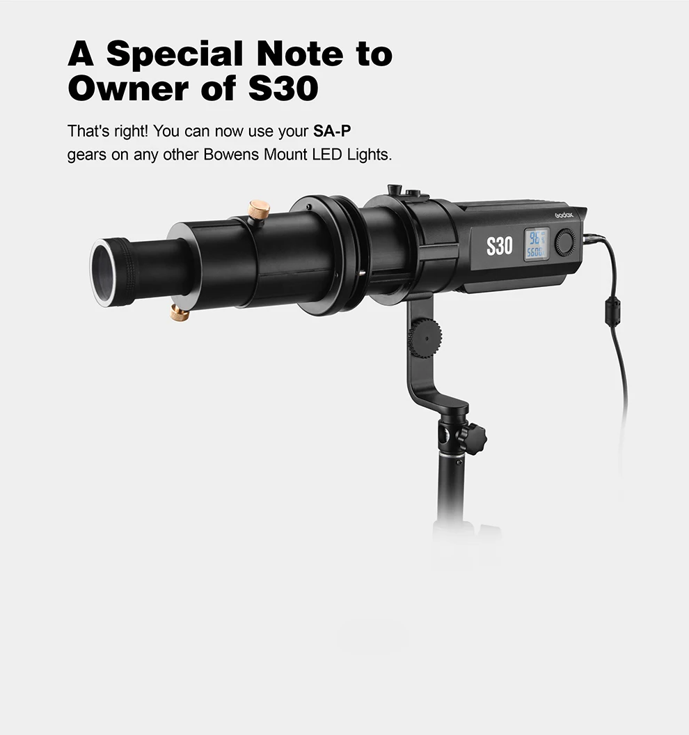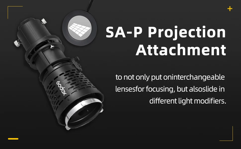 2. Должен быть utilisé avec le projecteur SA-P | Проекция SA-P (vendu séparément) может быть utilisé avec de nombreux accessories for générer des effets de Light créatifs. Может не seulement remplacer enteentes lentilles, но также добавить дайверов аксессуары для освещения, гостиницы, которые diaphragme d'iris Godox SA-06, gride gribouyle Godox SA-05, l'ensemble de GOBO SA-09, obturateur de frame SA-07, godox SA-11C/SA-11T гели цветные, корректирующие цвет и crée diverses воздействия.