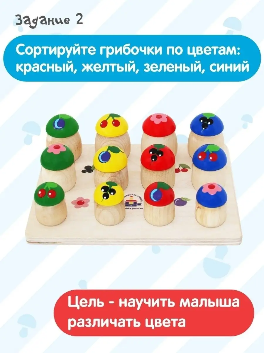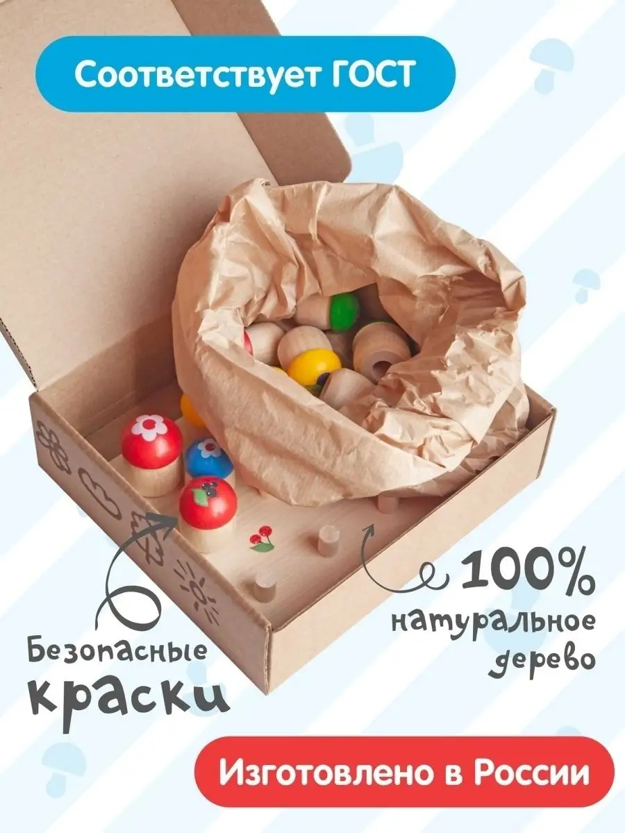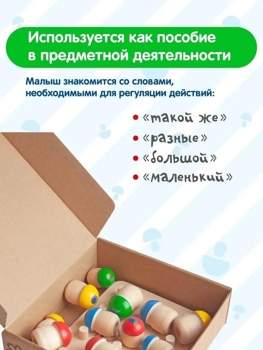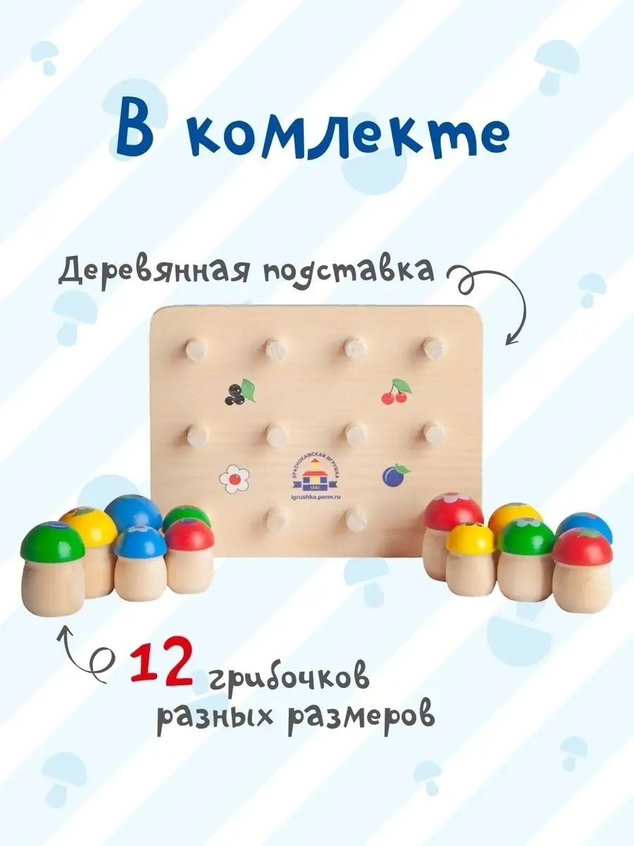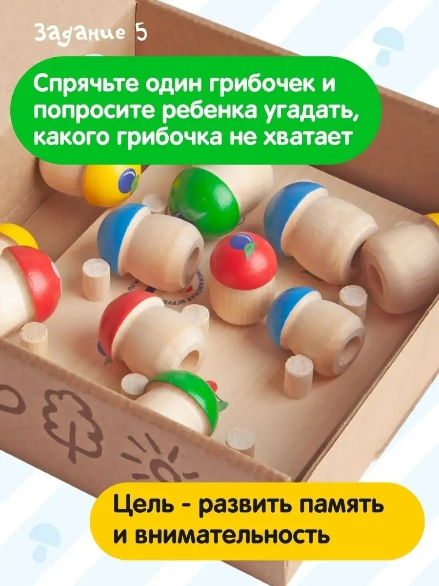 Комплектация Деревянные грибочки - 12 шт; многофункциональный сортер - счет, цвета, формы, большой-маленький; подставка для игры