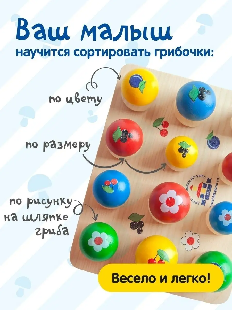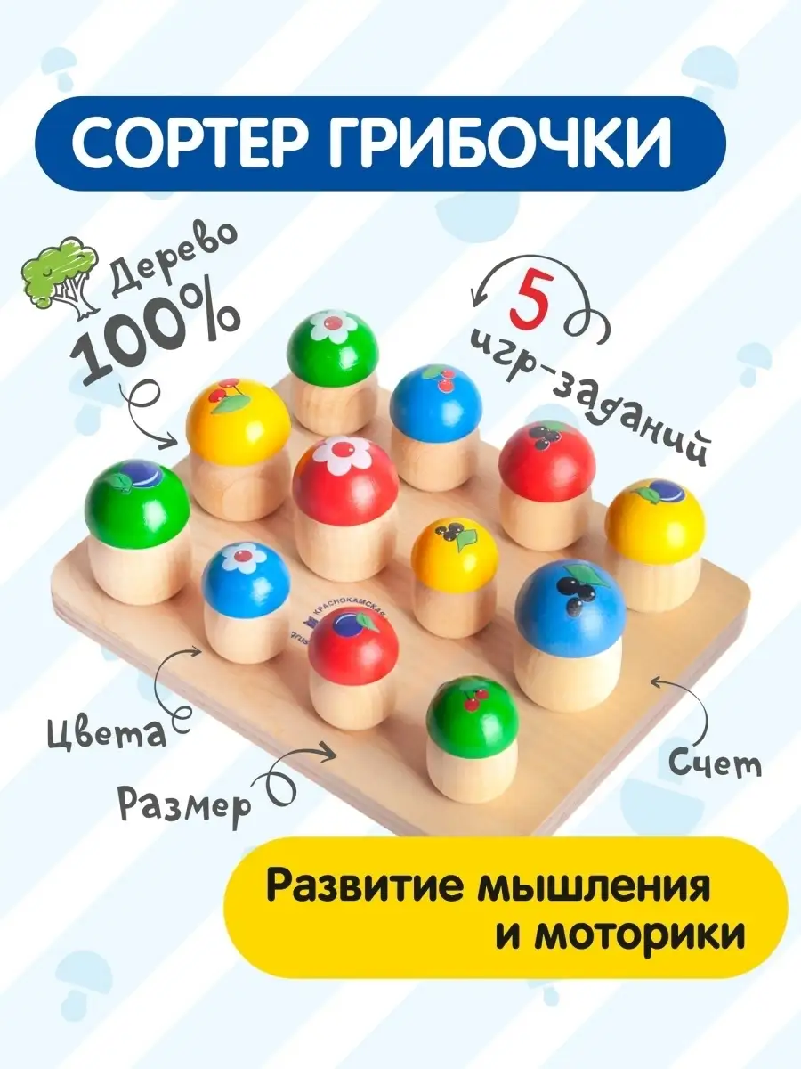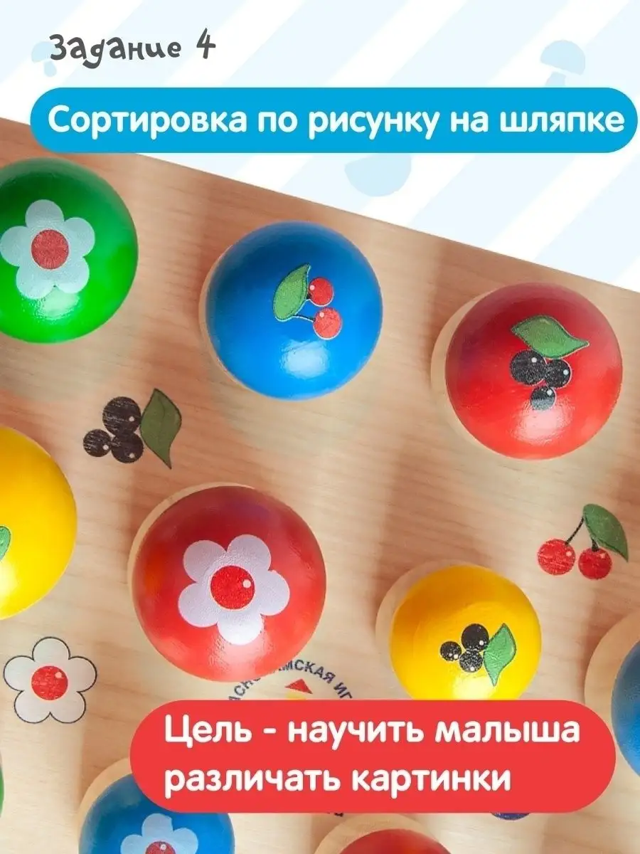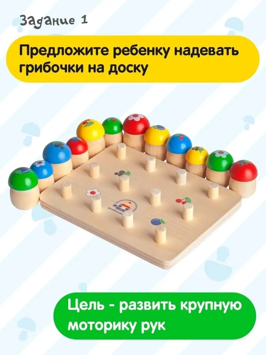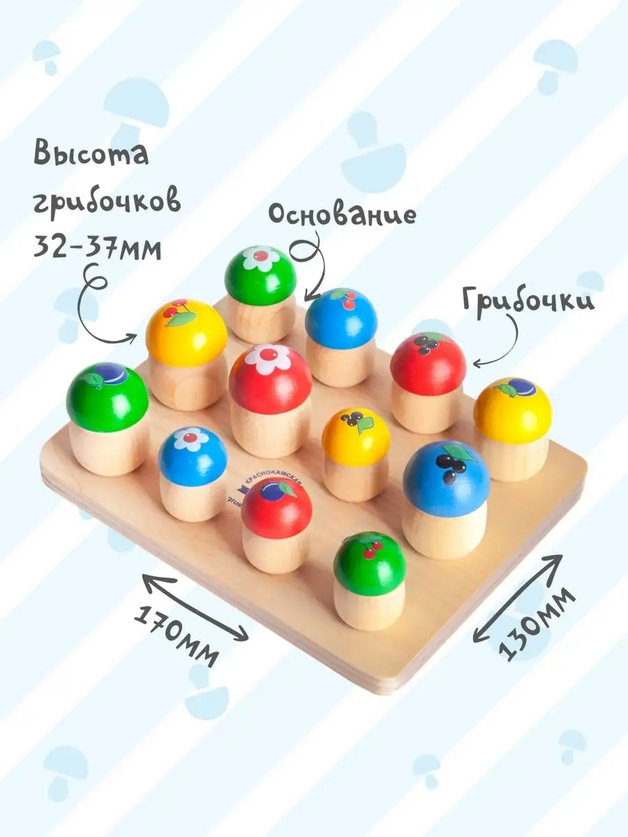 Комплектация Деревянные грибочки - 12 шт; многофункциональный сортер - счет, цвета, формы, большой-маленький; подставка для игры