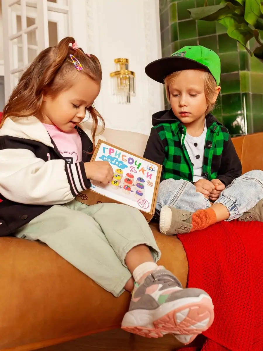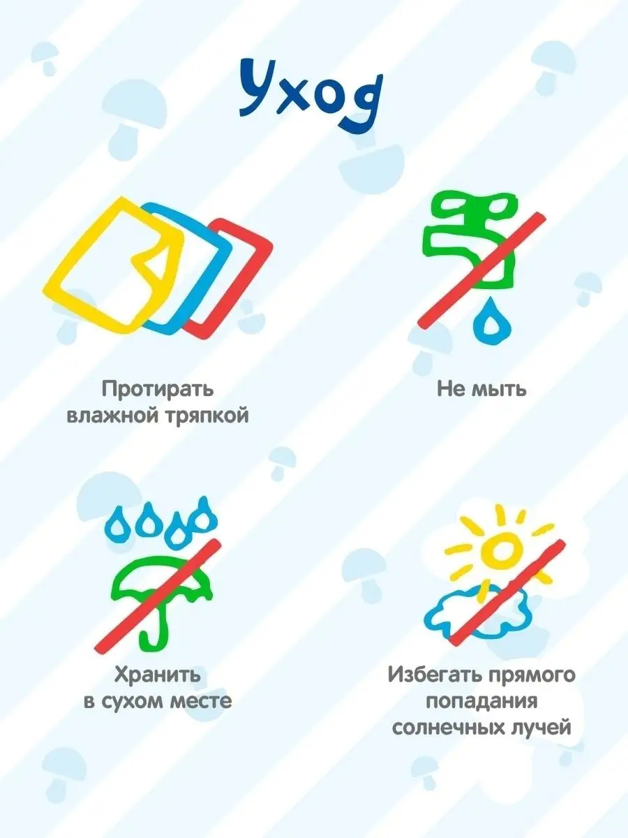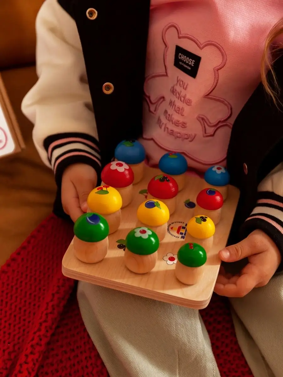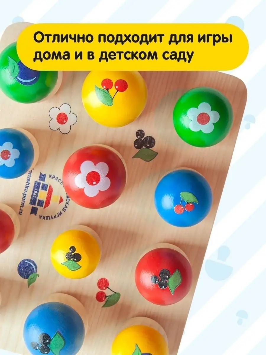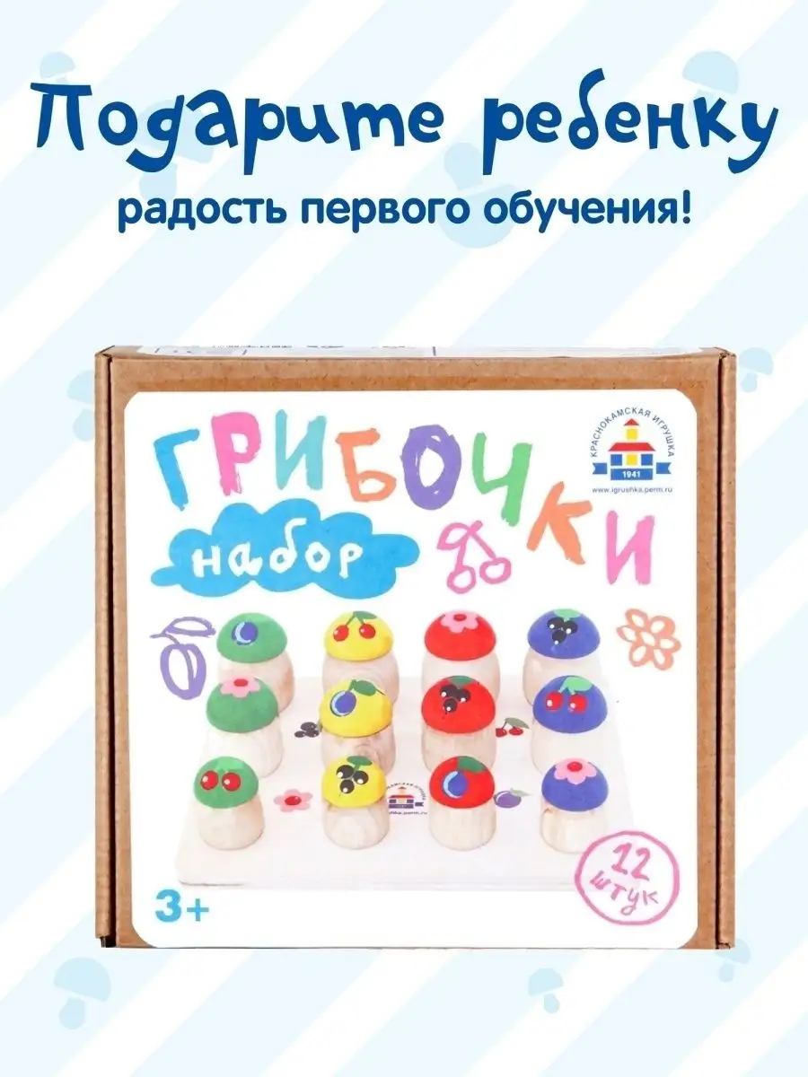 Комплектация Деревянные грибочки - 12 шт; многофункциональный сортер - счет, цвета, формы, большой-маленький; подставка для игры