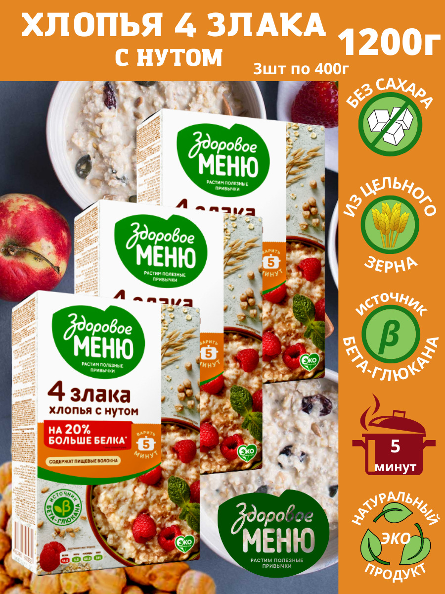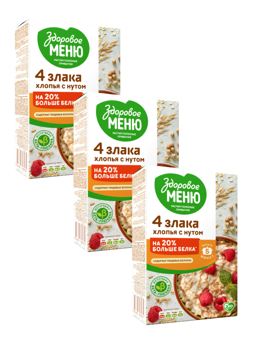 Набор Хлопья зерновые Здоровое меню Экстра 4 злака с нутом. Каша быстрого приготовления 400г.х3шт