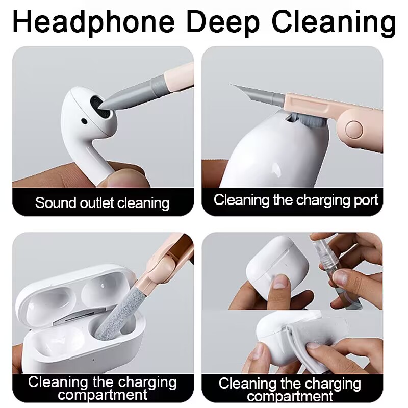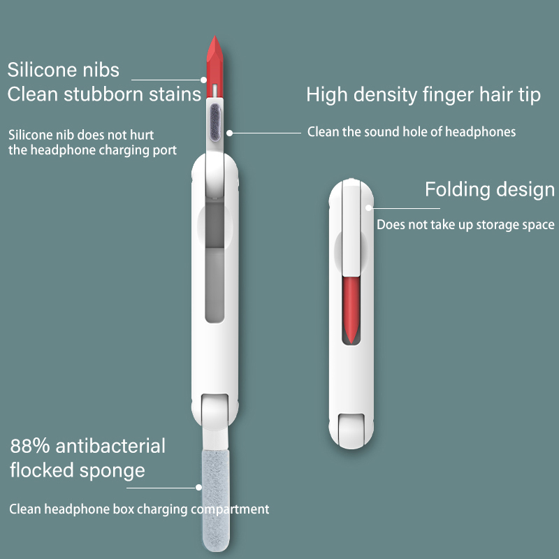 1. Многофункциональный Набор для очистки: флокирующая губка может очистить пыль в беспроводной зарядной коробке гарнитуры. Щетка высокой плотности может очистить грязь на звуковом выходе гарнитуры. Наконечник может очистить упрямую пыль