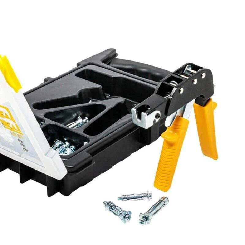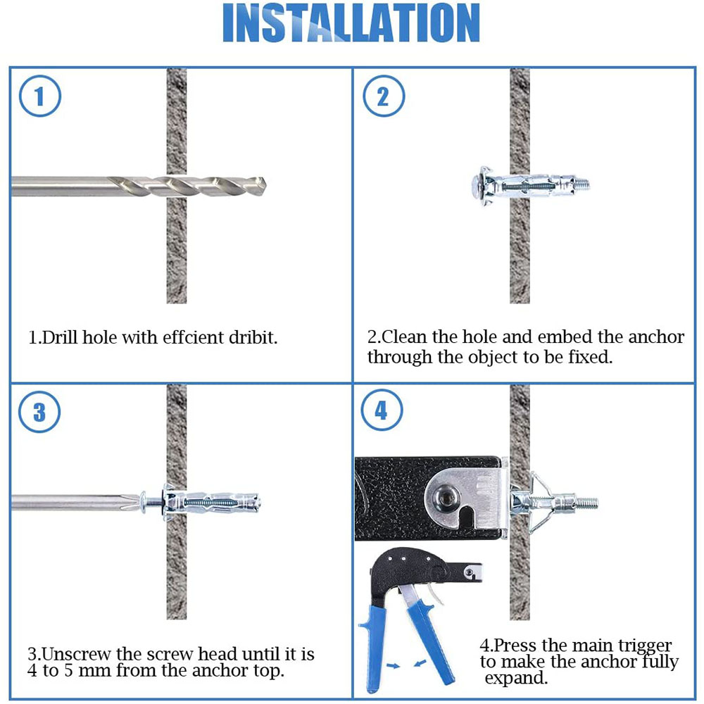 【Инструкции по использованию】-Используется для точной и быстрой установки полых настенных креплений в полую стену. Поместите анкер в предварительно просверленное отверстие, прикрепите установочный инструмент и Сожмите спусковой крючок.