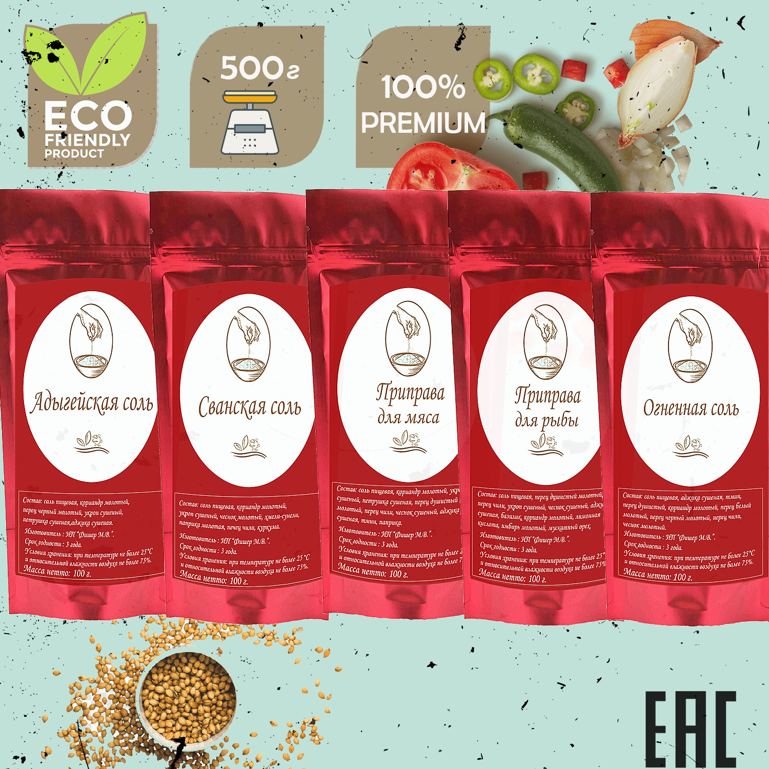 Набор из 5 приправ, 500 г / соль Адыгейская, Сванская, Огненная; Приправа для мяса, для рыбы
