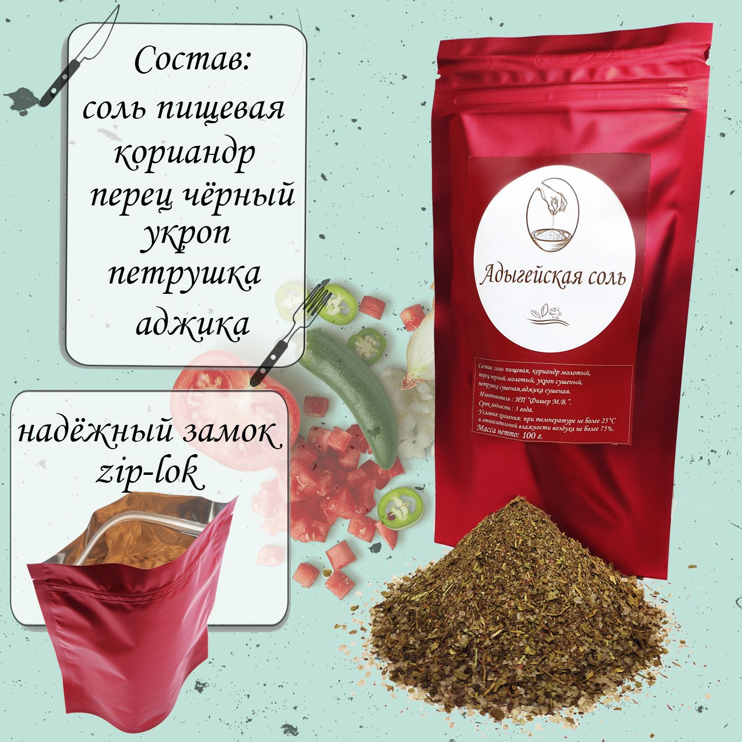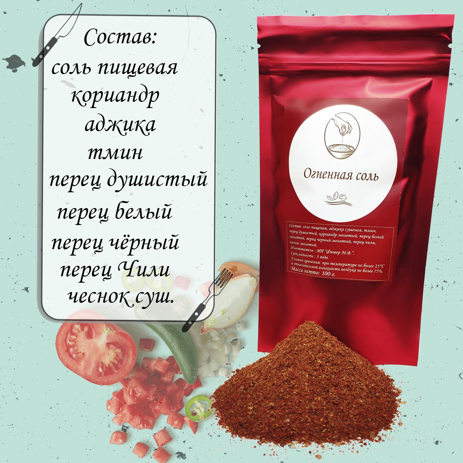 Приправа к мясу: соль пищевая, кориандр мол., укроп суш., петрушка суш., перец душистый мол., перец Чили мол., чеснок мол., аджика суш., тмин мол., паприка мол.. Приправа к рыбе: соль пищевая, перец душистый мол., перец Чили мол., укроп суш., чеснок мол., аджика суш., базилик суш., кориандр мол., лимонная кислота, имбирь, мускатный орех мол. Соль Адыгейская: соль пищевая, кориандр молотый, перец чёрный молотый, укроп сушеный, петрушка сушеная, аджика сушеная. Соль Сванская: соль пищевая, кориандр молотый, укроп сушеный, чеснок молотый, хмели-сунели, паприка молотая, перец чили молотый, куркума. Соль Огненная: соль пищевая, аджика сушеная, тмин молотый, перец душистый молотый, кориандр молотый, перец белый, перец черный, перец Чили, чеснок молотый.