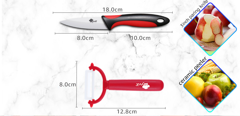 Этот керамический нож включает3 ''4'' 5 ''6'' дюймовый нож + Чехлы + 1 овощечистка.Они сделаны изМатериал АБС и керамика.