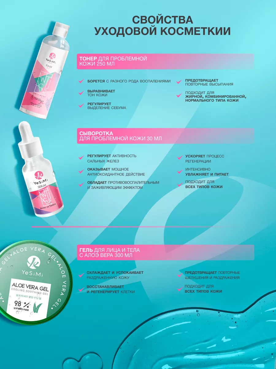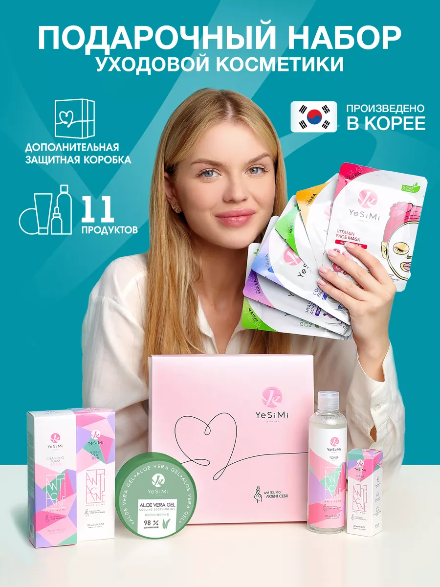 Артикул 165407614 Состав косметическая основа; 6 шт набор масок корейских; сыворотка от прыщей и акне; тонер корейских уход; пенка очищающая; пилинг-скатка для лица; гель для тела алоэ