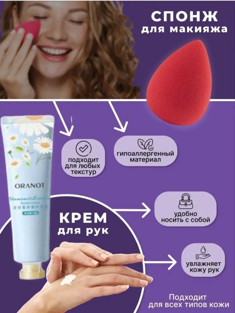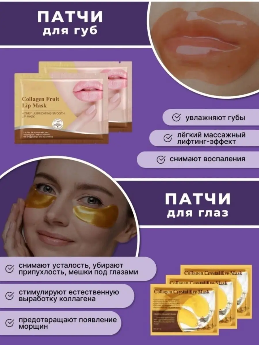Комплектация Маски для лица 5 шт; патчи для глаз 3 шт; Патчи для губ 2 шт; повязка для волос 1 шт; крем для рук и спонж для макияжа