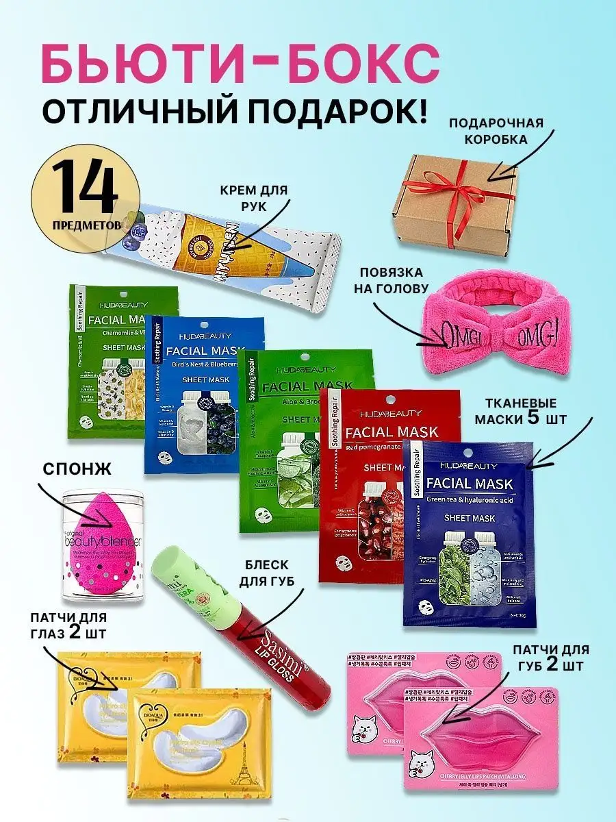 Комплектация маска тканевая 5 штук, повязка на голову 1 штука; патчи для глаз 2 шт, патчи для губ 2 шт; спонж 1 шт, блеск 1 шт.; Крем для рук 1 штука; Подарочная коробка 1 шт.