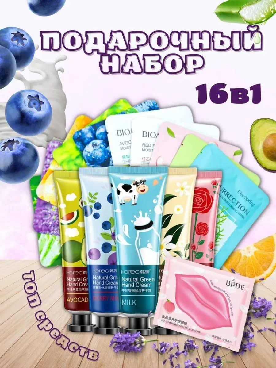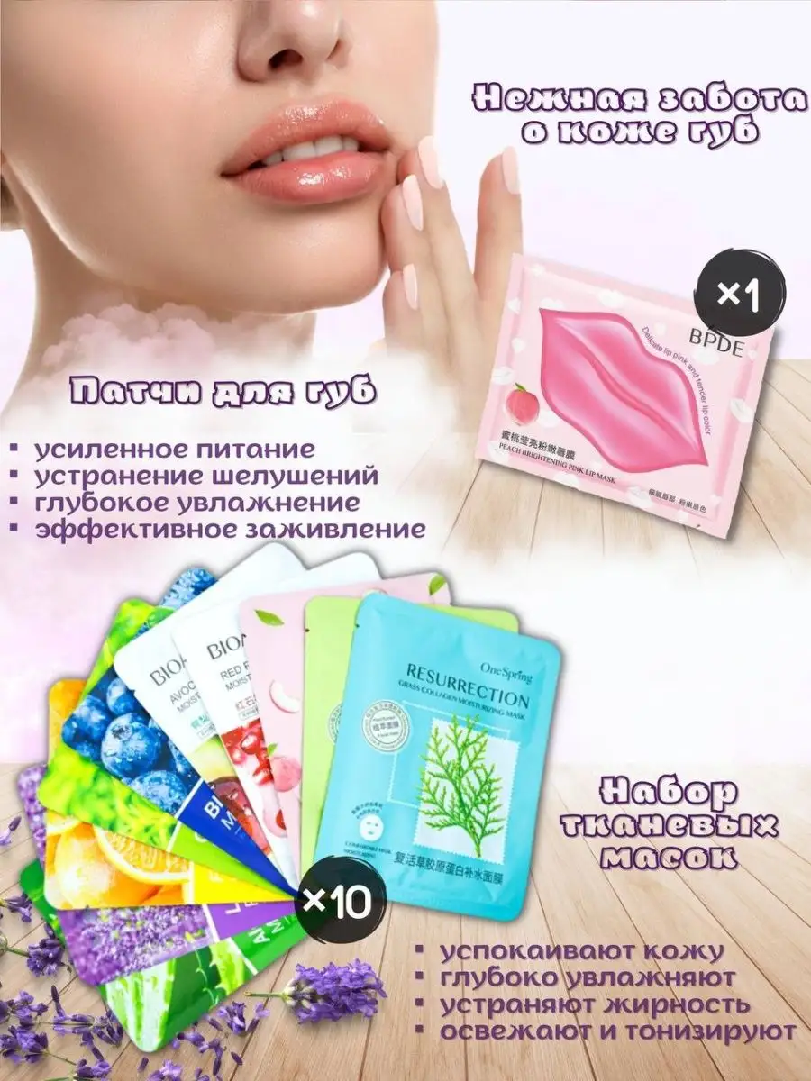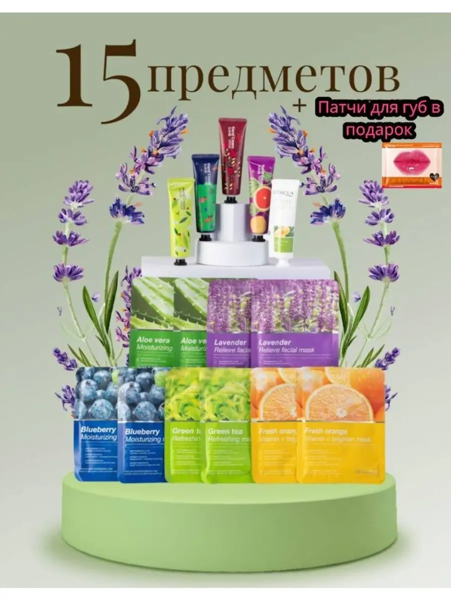 Комплектация тушь; тканевые маски для лица; карандаш для губ; Масло для губ; крем-кушон