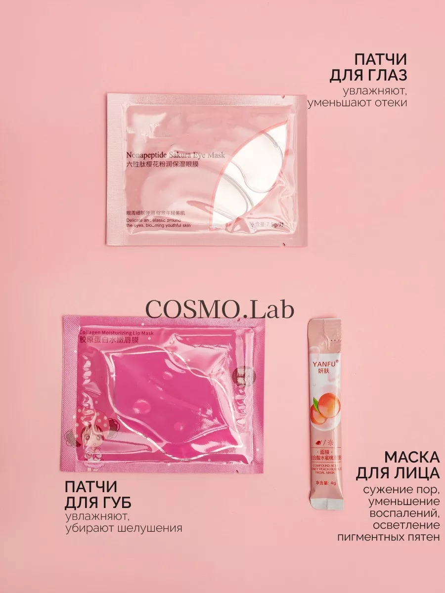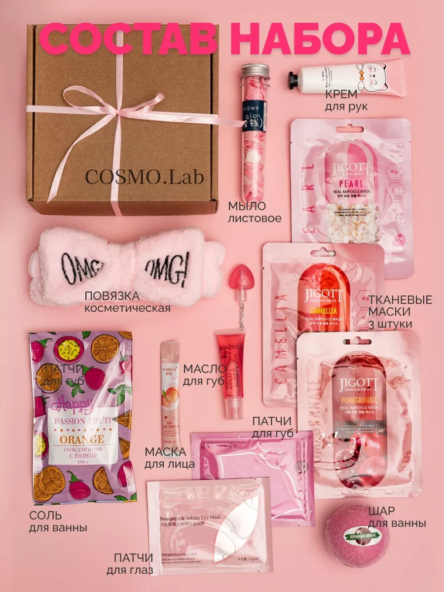 Комплектация соль для ванн; Пузырьковая маска; тканевые маски; патчи; листовое мыло для рук
