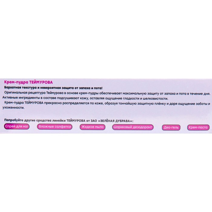 Оригинальная рецептура Теймурова в основе крем-пудры обеспечивает максимальную защиту от запаха и пота в течение дня. Активные ингредиенты в составе подсушивают кожу, оставляя ощущение гладкости и шелковистости.