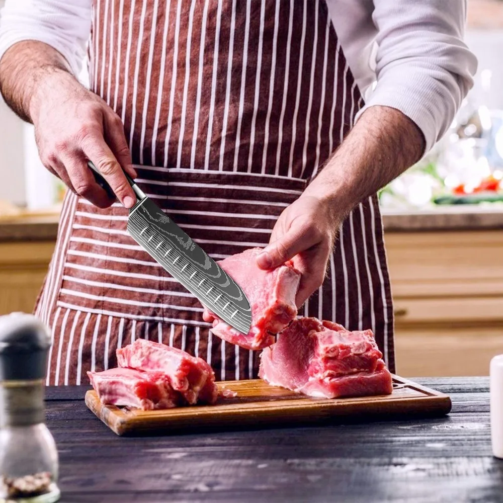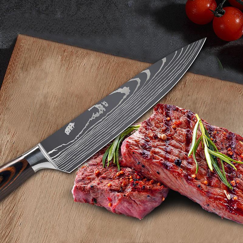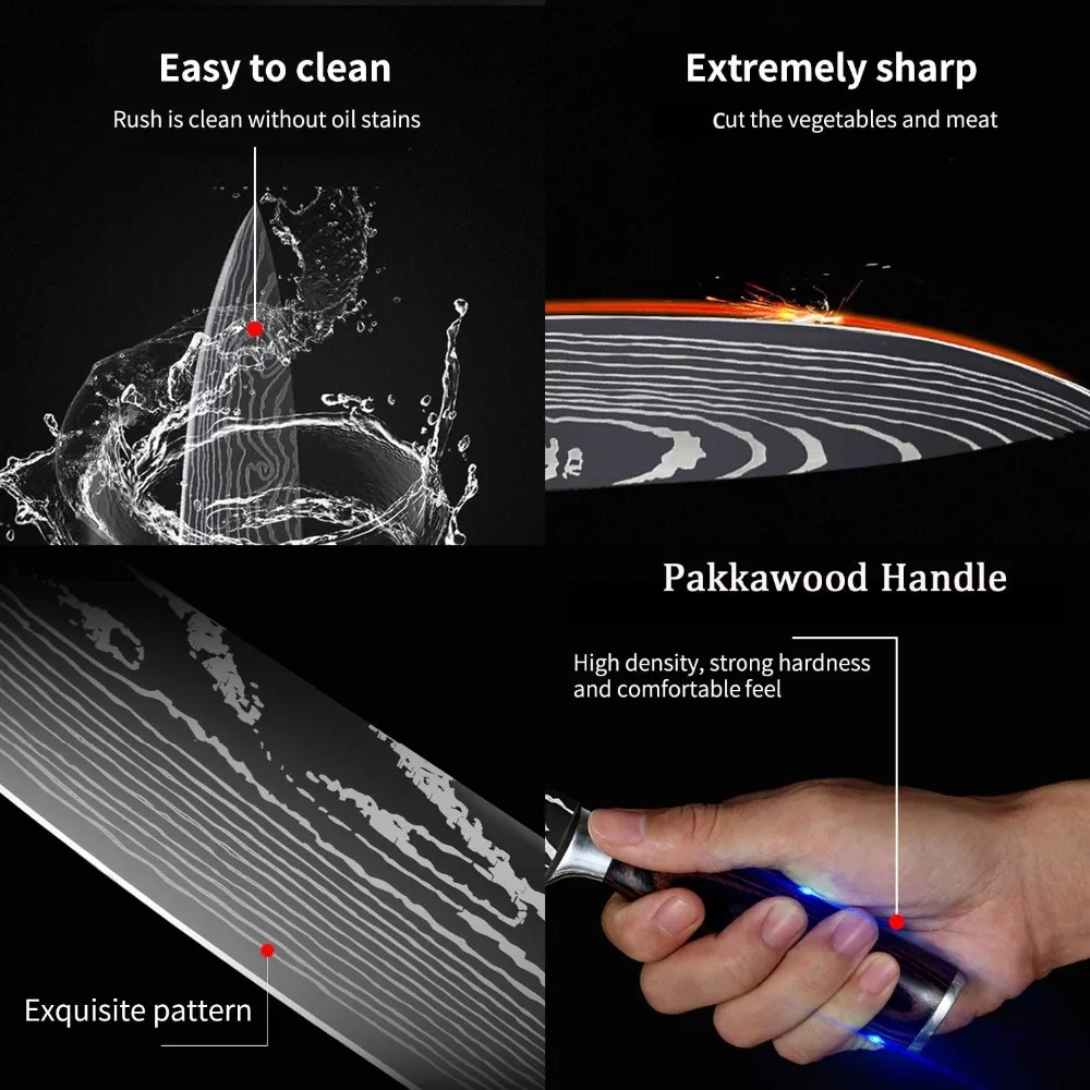 Лезвие из нержавеющей стали 7CR17, поверхность с лазерным Дамасским узором, очень красивая, хорошее качество изготовления, бритвенная острота, держите кухню подальше от тупого ножа и наслаждайтесь кухонной жизнью!