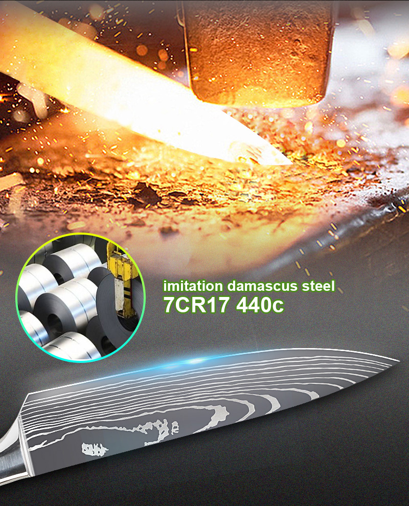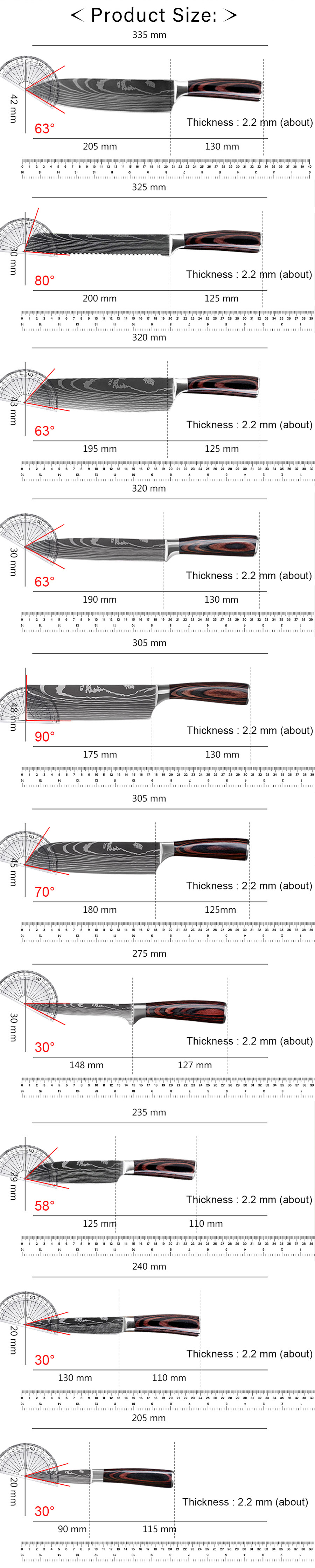 Советы: лезвие изготовлено из нержавеющей стали 7CR17, а не из настоящего Дамаска, поверхность лазерного Дамасского узора, очень красивая, хорошее качество изготовления, бритвенная острота, держите кухню подальше от тупого ножа, и наслаждайтесь своей кухней.