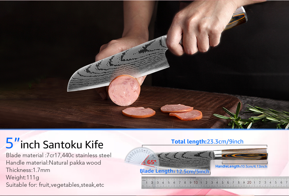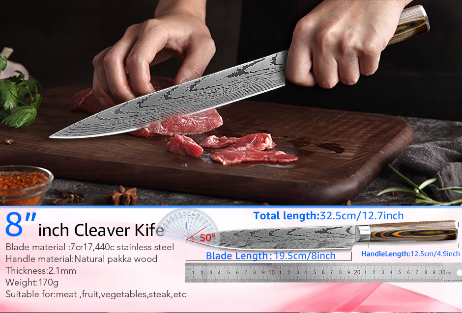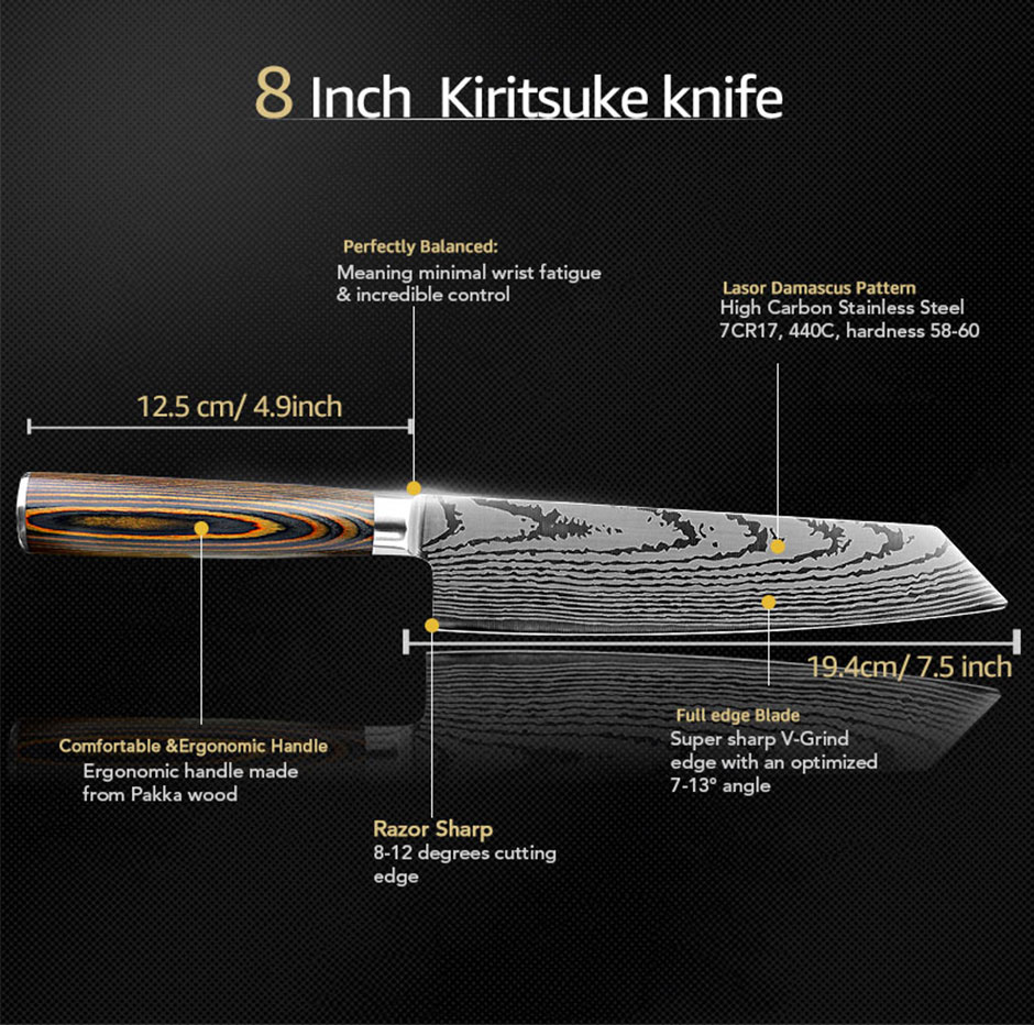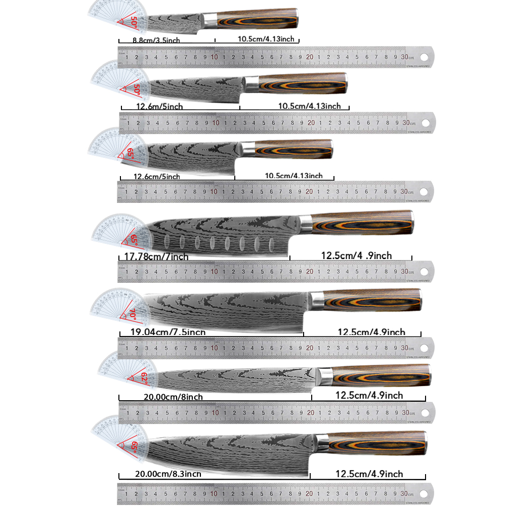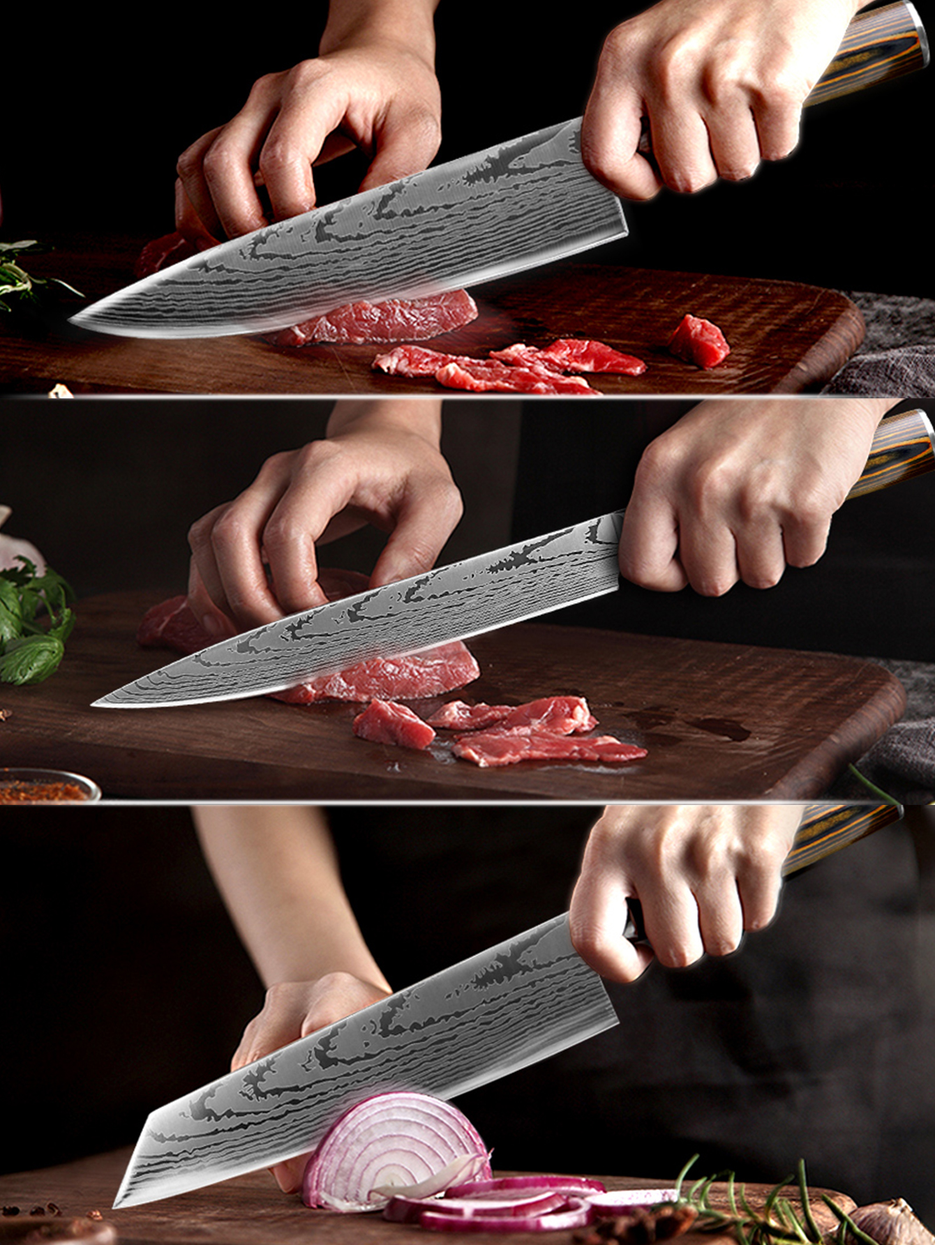 Набор кухонных ножей, профессиональный шеф-повар 7CR17 из немецкой нержавеющей стали, лазерный резец Дамасского цвета для нарезки мяса, сантоку