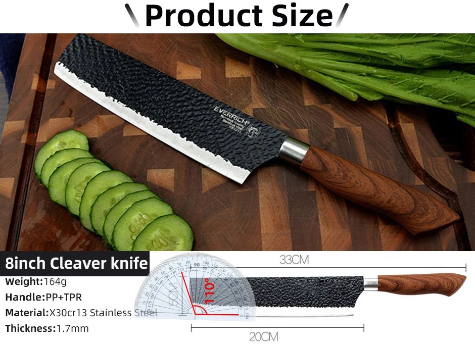 8-дюймовый нож-тесак-типичный Тесак имеет толстый позвоночник и очень сильное лезвие, которое позволяет ему разрезать кости и мясо в движении измельчения. Это также очень полезно для измельчения твердых и толстых материалов, таких как тыква или тыква.
