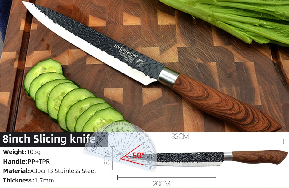 8-дюймовый Нож для резьбы-разделочный нож намного тоньше, чем нож шеф-повара (особенно в области позвоночника), что позволяет ему вырезать более тонкие и точные ломтики.